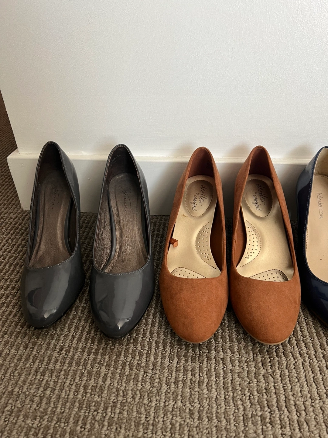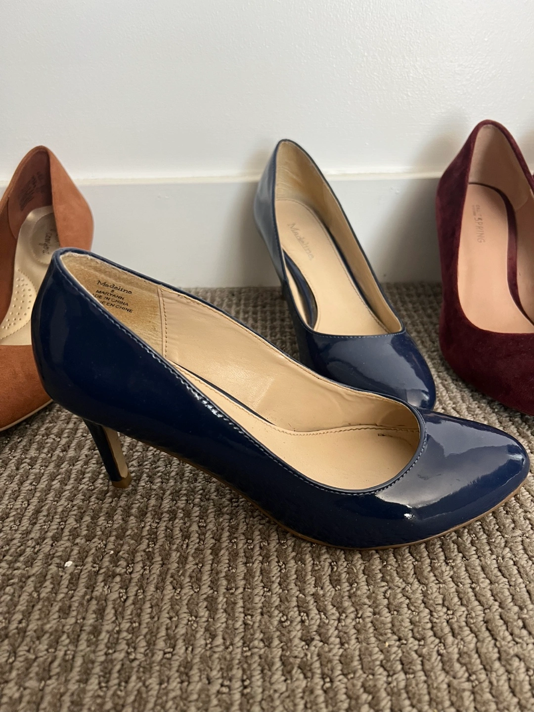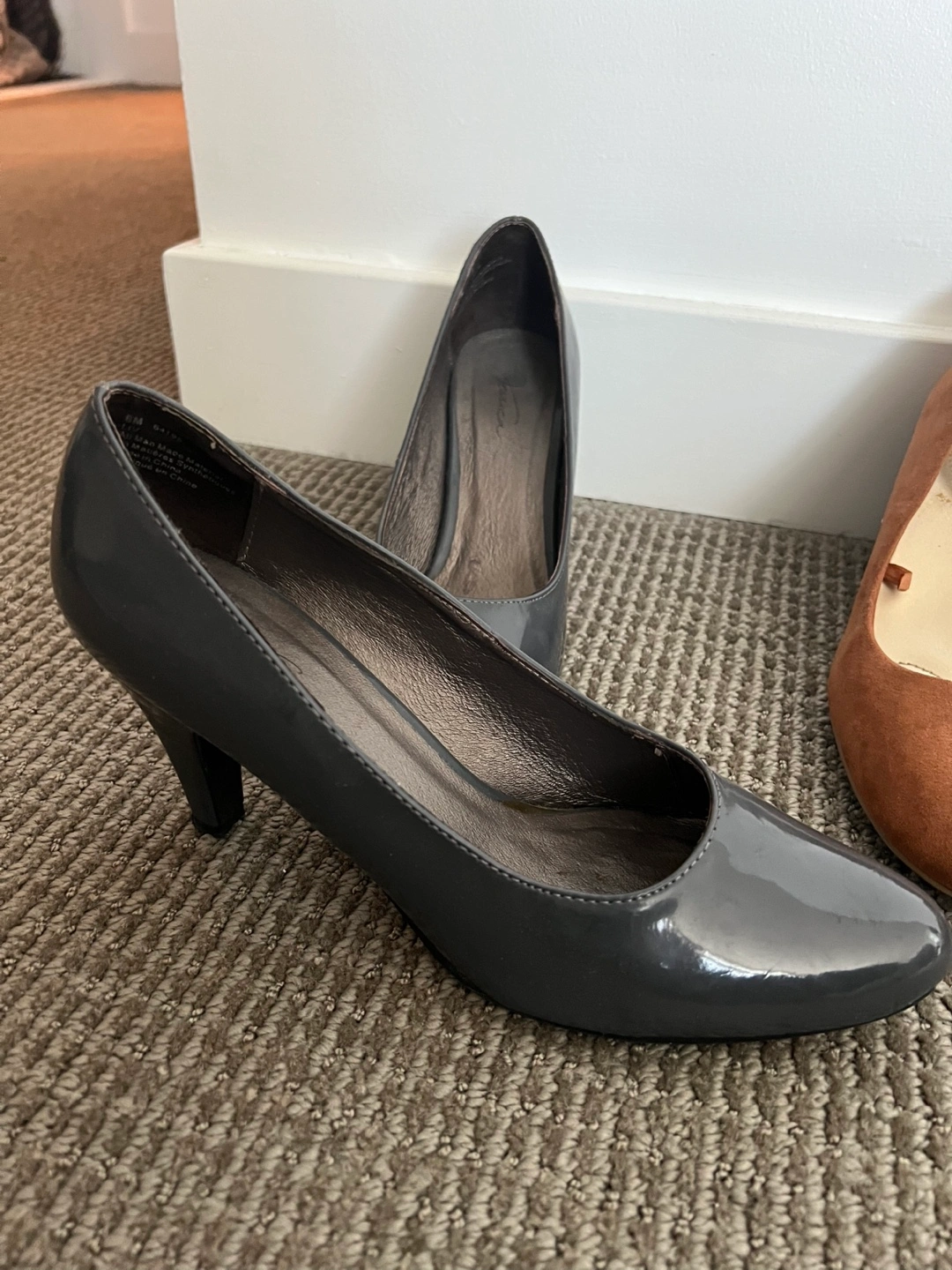 Four pairs of women's low heels. Brown suede, grey patent leather, navy patent leather, and burgundy suede. All size 8 except for burgundy which is 8.5. All pairs have been worn once or never worn.