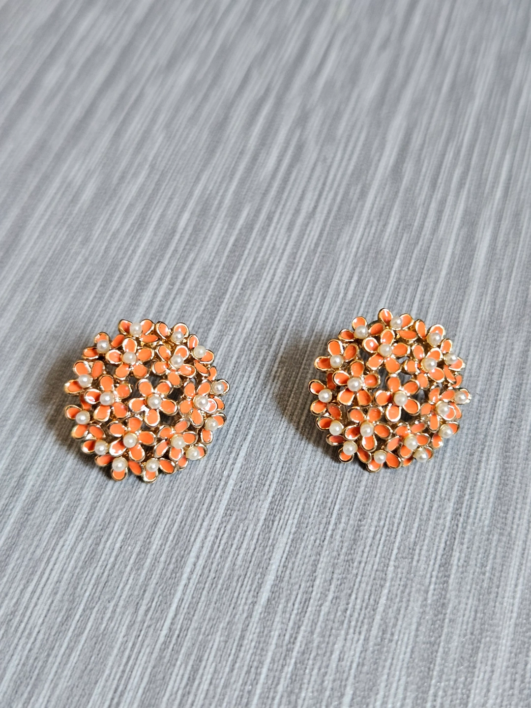 Beautiful pair of stud earrings. Orange flower design. Small pearls in the center of each flower. Gold-toned metal.