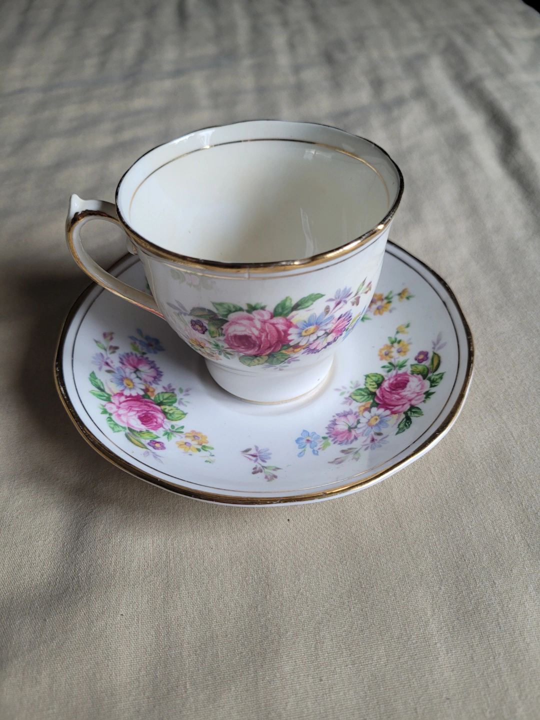From Salisbury china in the UK, this lovely demitasse duo is so pretty. It has a stunning design simply called ‘floral’, with bright posies of mixed flowers and gilt trim. The cup measures 7.5cm diameter and 6.3cm in eight, while the saucer is 12.5cm diameter. Both pieces are in very good order. has little nick out of it as shown in photos