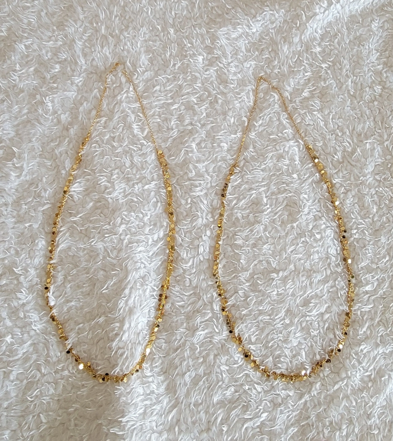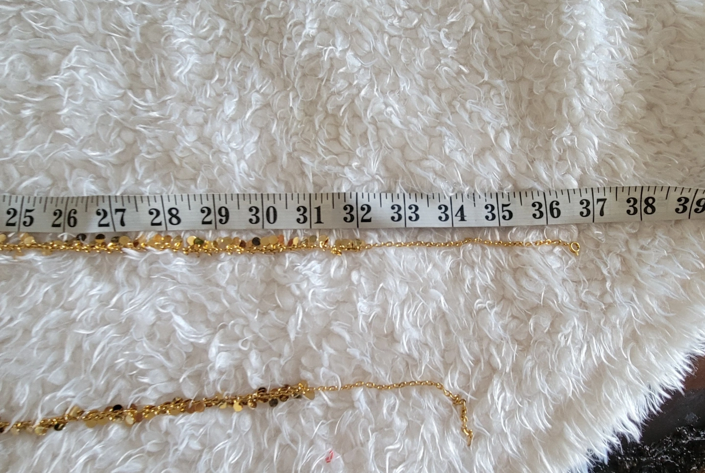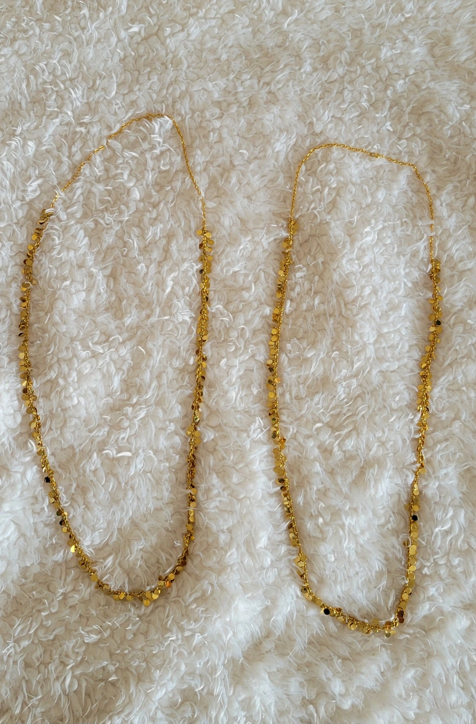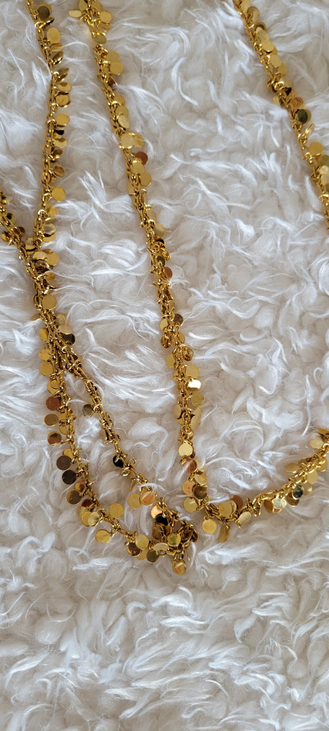 Two gold belly chains. Small gold coins hang from delicate chains. 32 inches long, with 4 inches extender chain. Perfect for dance or festival wear. Comes in a lovely red velvet pouch.