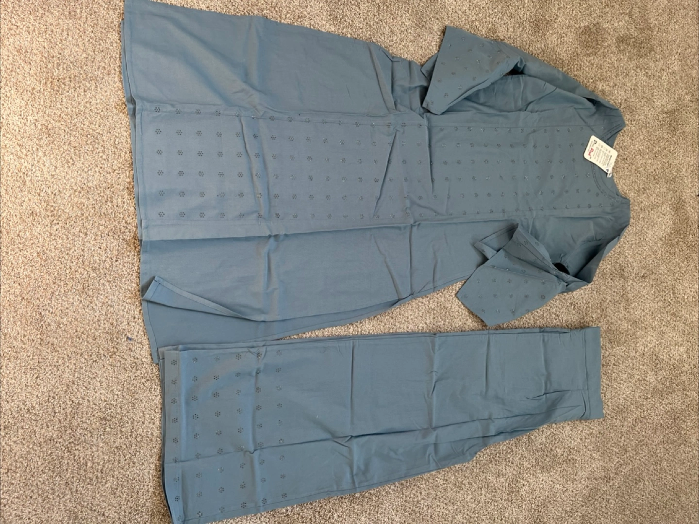 Beautiful two-piece suit. Features a kurta and matching pants. Grey colour. Embroidered with small sparkly details. Looks great for any occasion.
