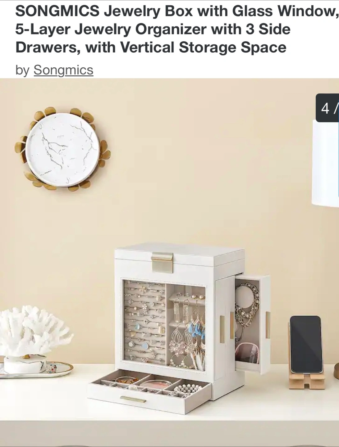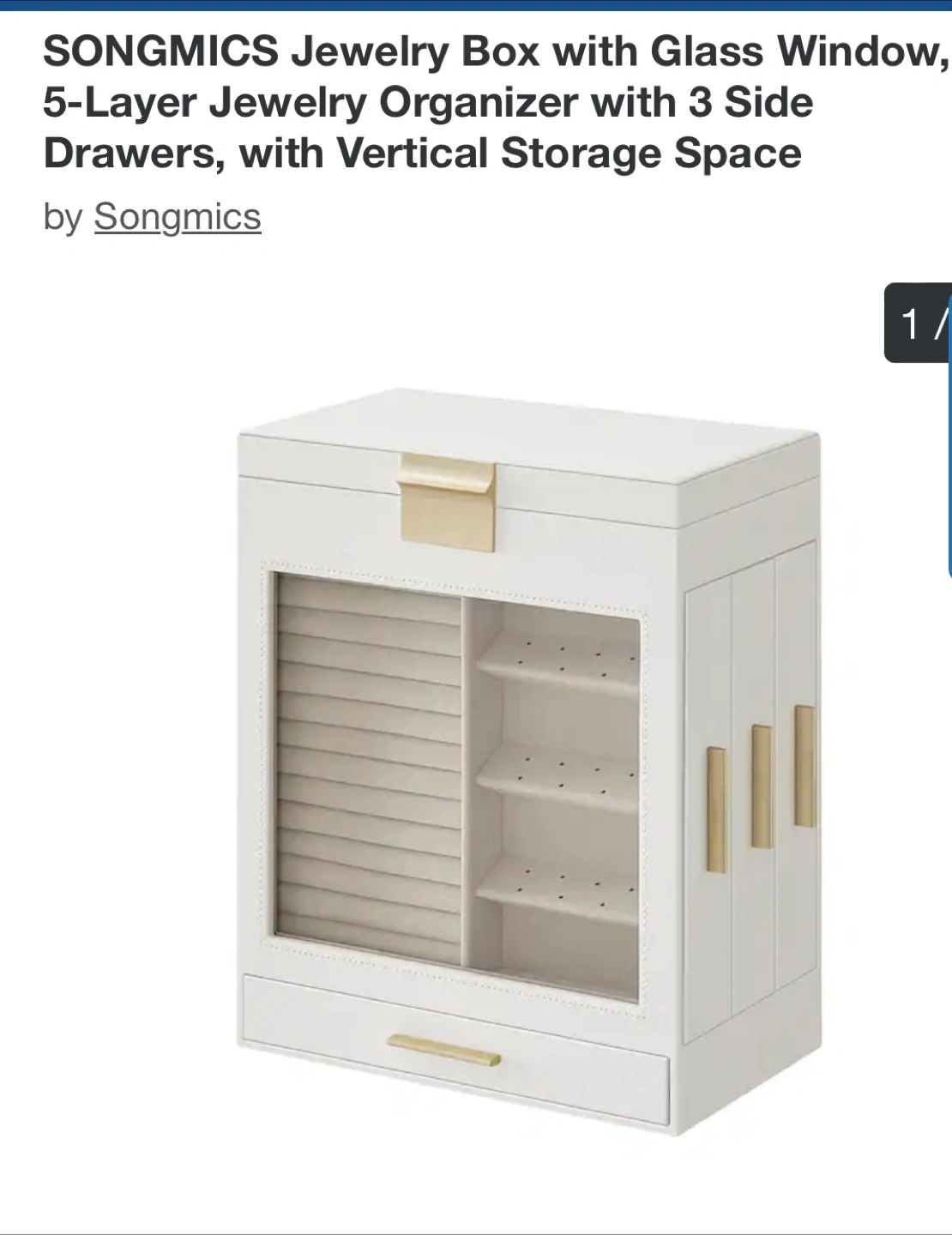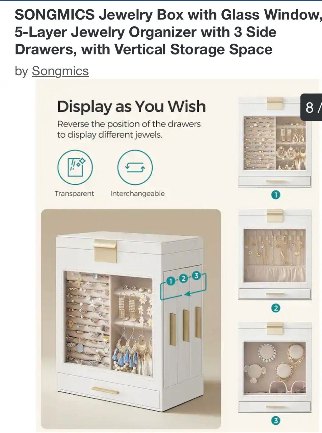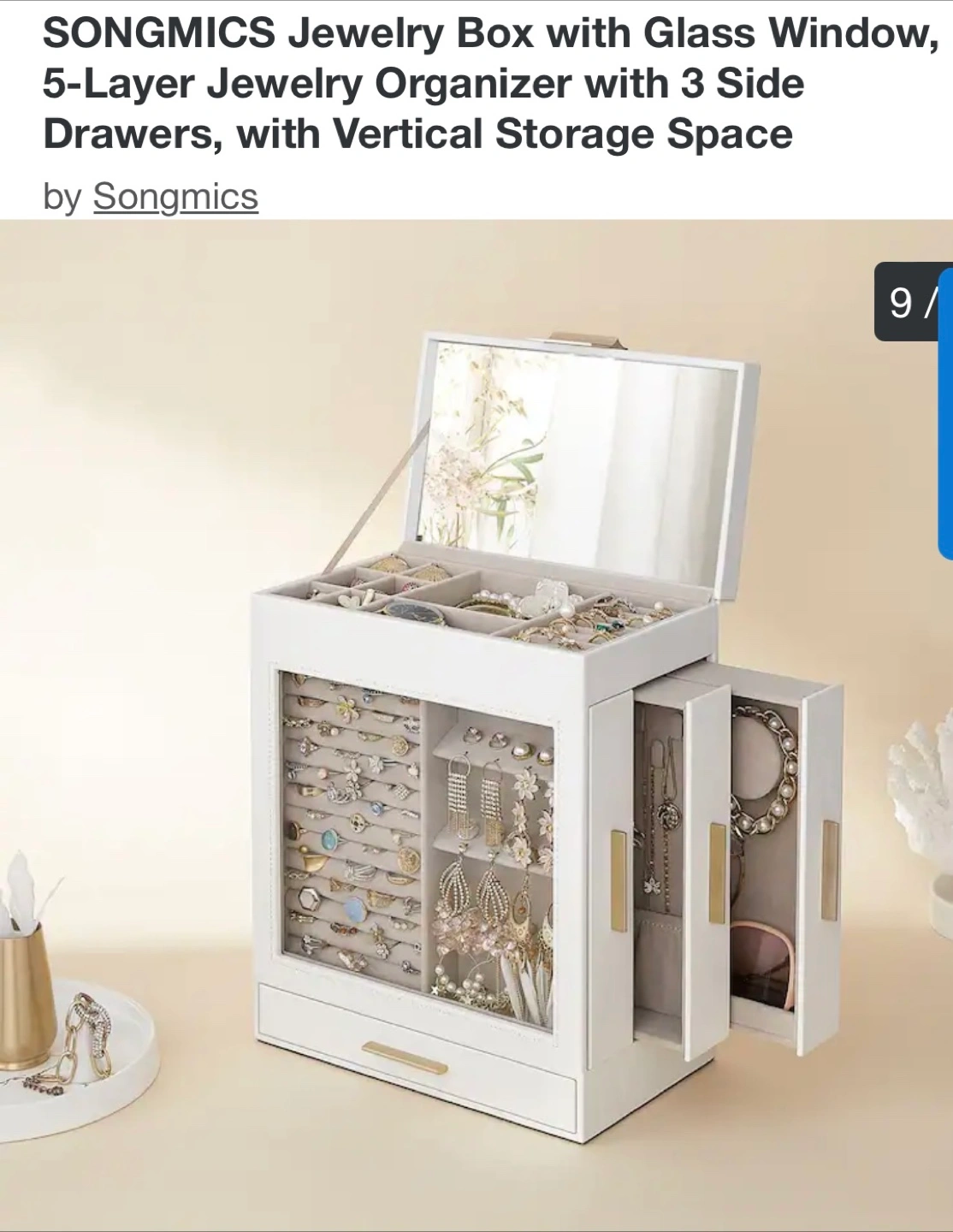 Five-layer jewelry organizer. Three side drawers. Vertical storage. Glass window display. Space-saving design. Organizes small items. Keeps jewelry tidy.