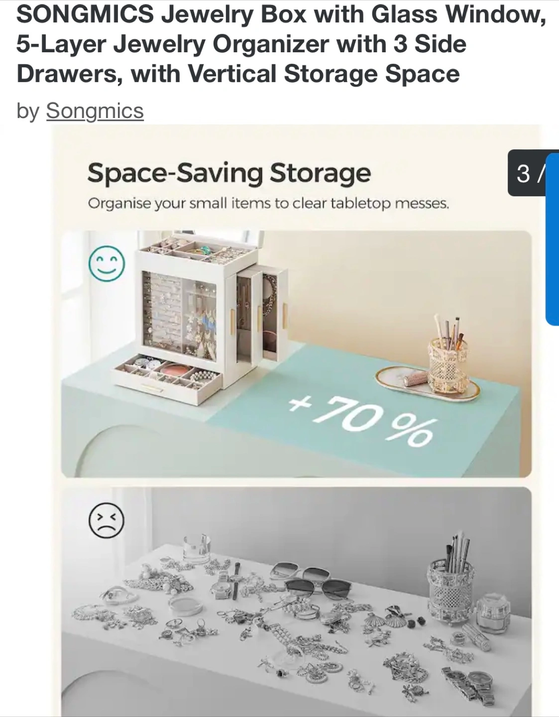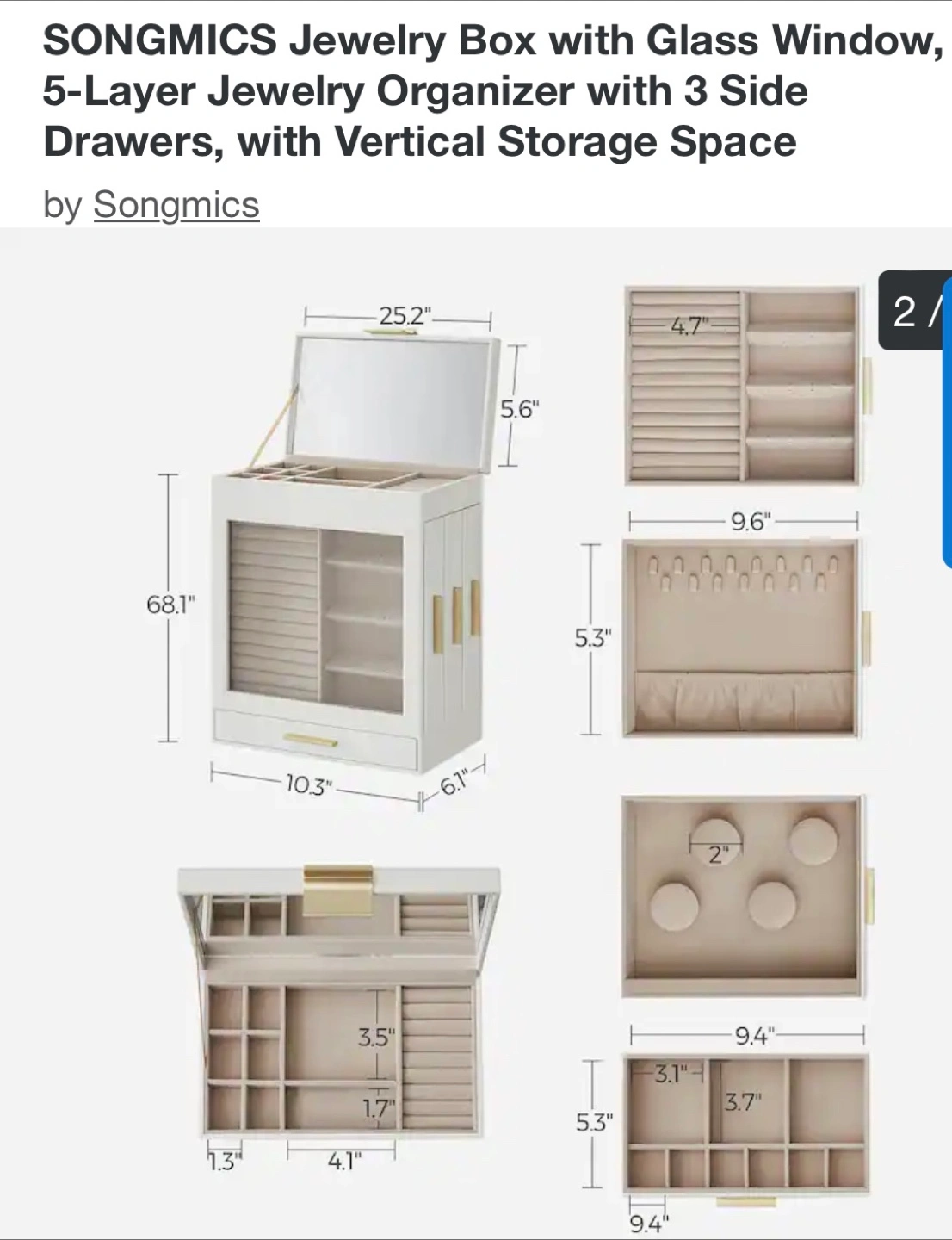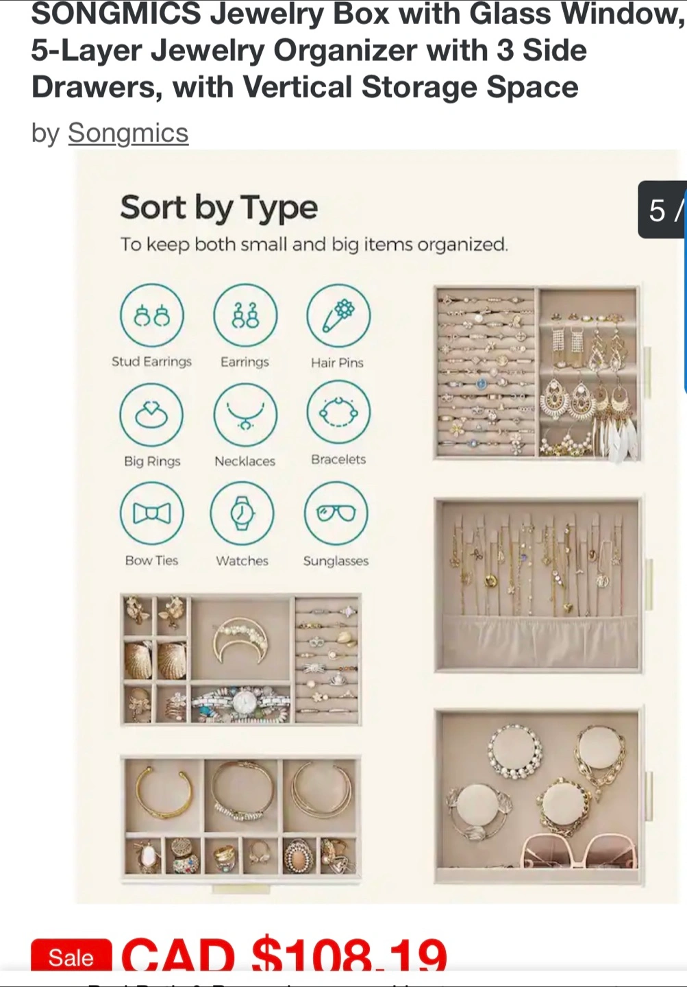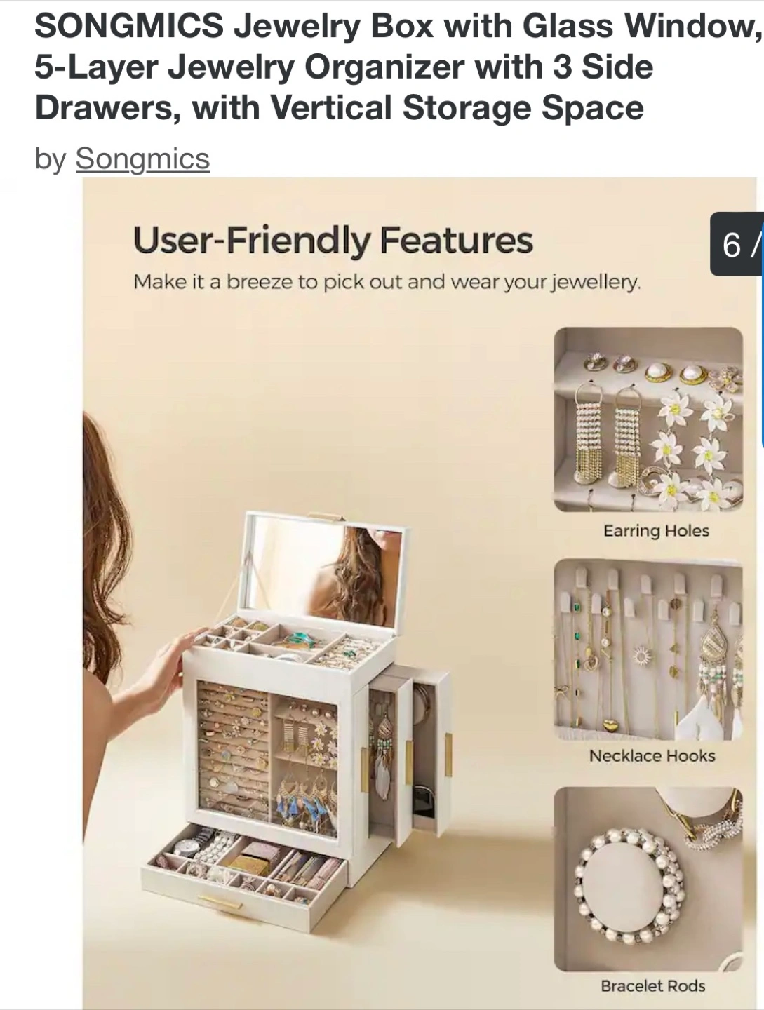 Five-layer jewelry organizer. Three side drawers. Vertical storage. Glass window display. Space-saving design. Organizes small items. Keeps jewelry tidy.