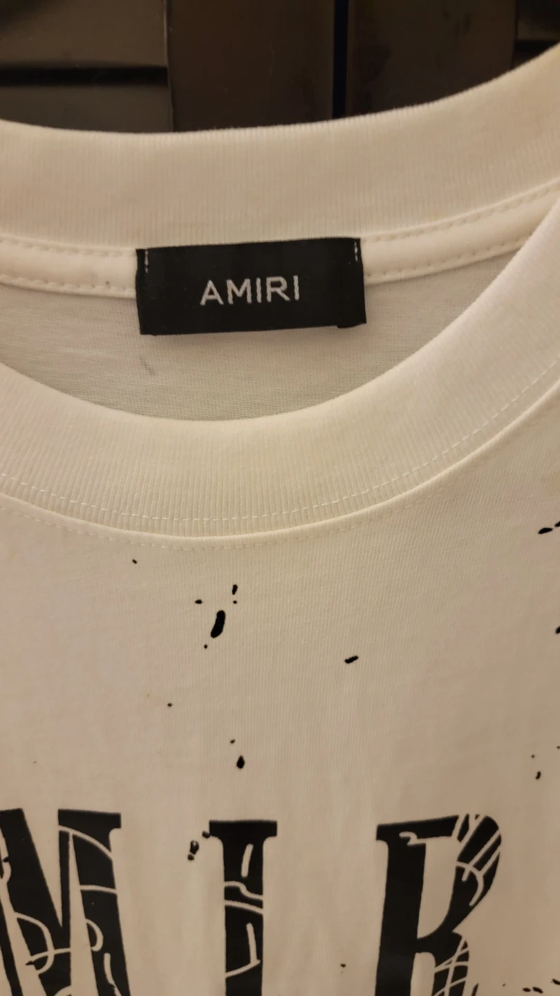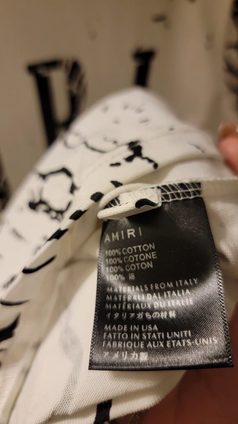 This is an Amiri t-shirt made from 100% cotton. It's a white tee with a black graphic print. Made in USA.