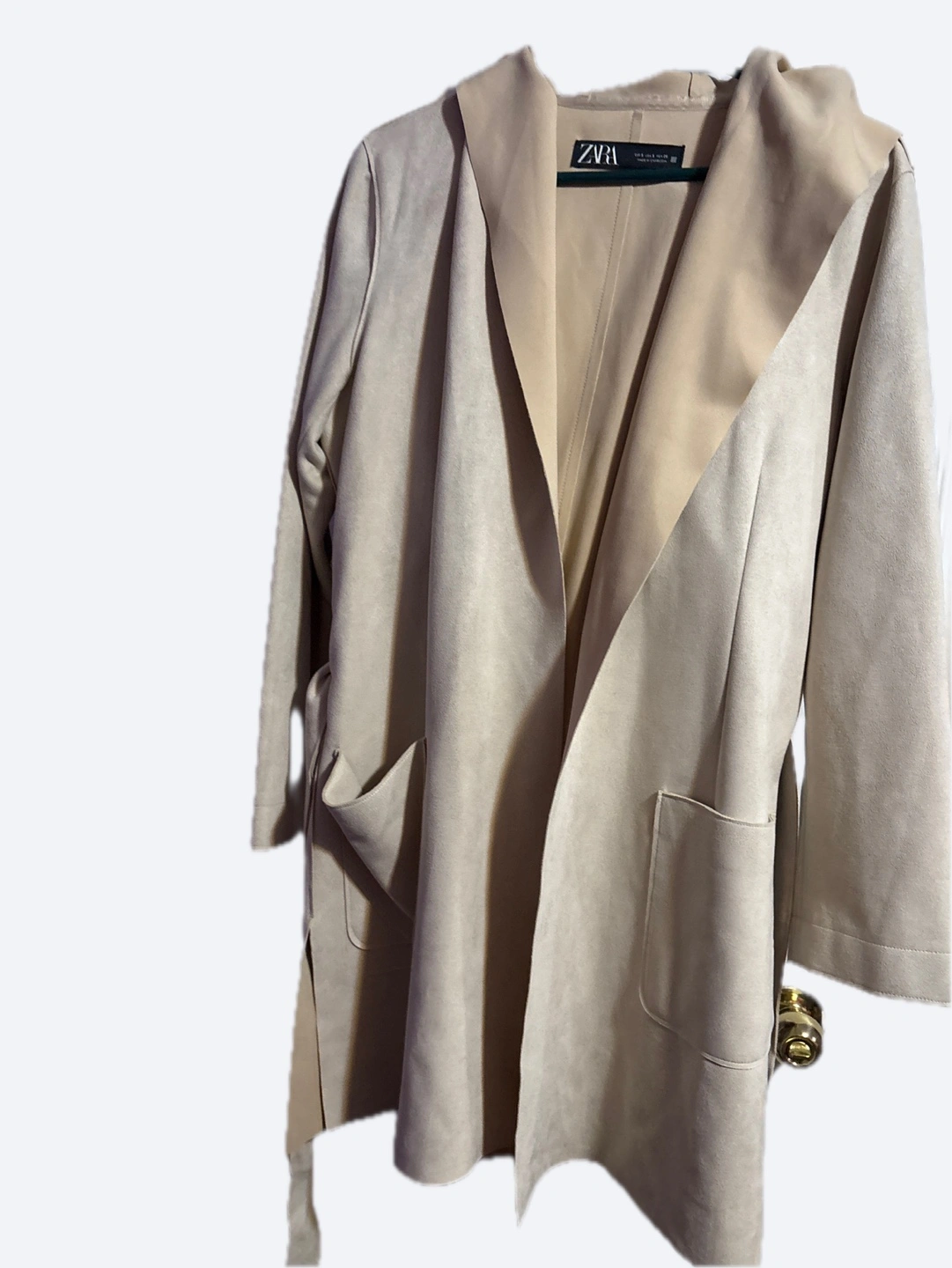 Women's beige suede jacket. Features a hood, long sleeves, pockets, and a tie belt. Size small. Made in Cambodia.