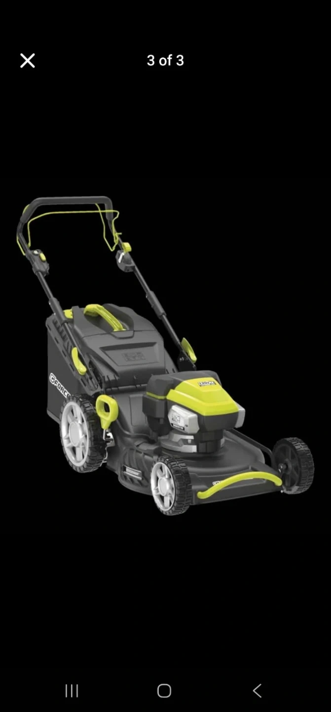 This G-Force lawn mower is 120V and self-propelled. It's a 3-in-1 model with a 22-inch cutting deck. Comes with two 5Ah batteries and a charger.