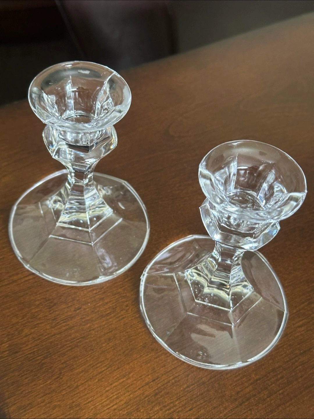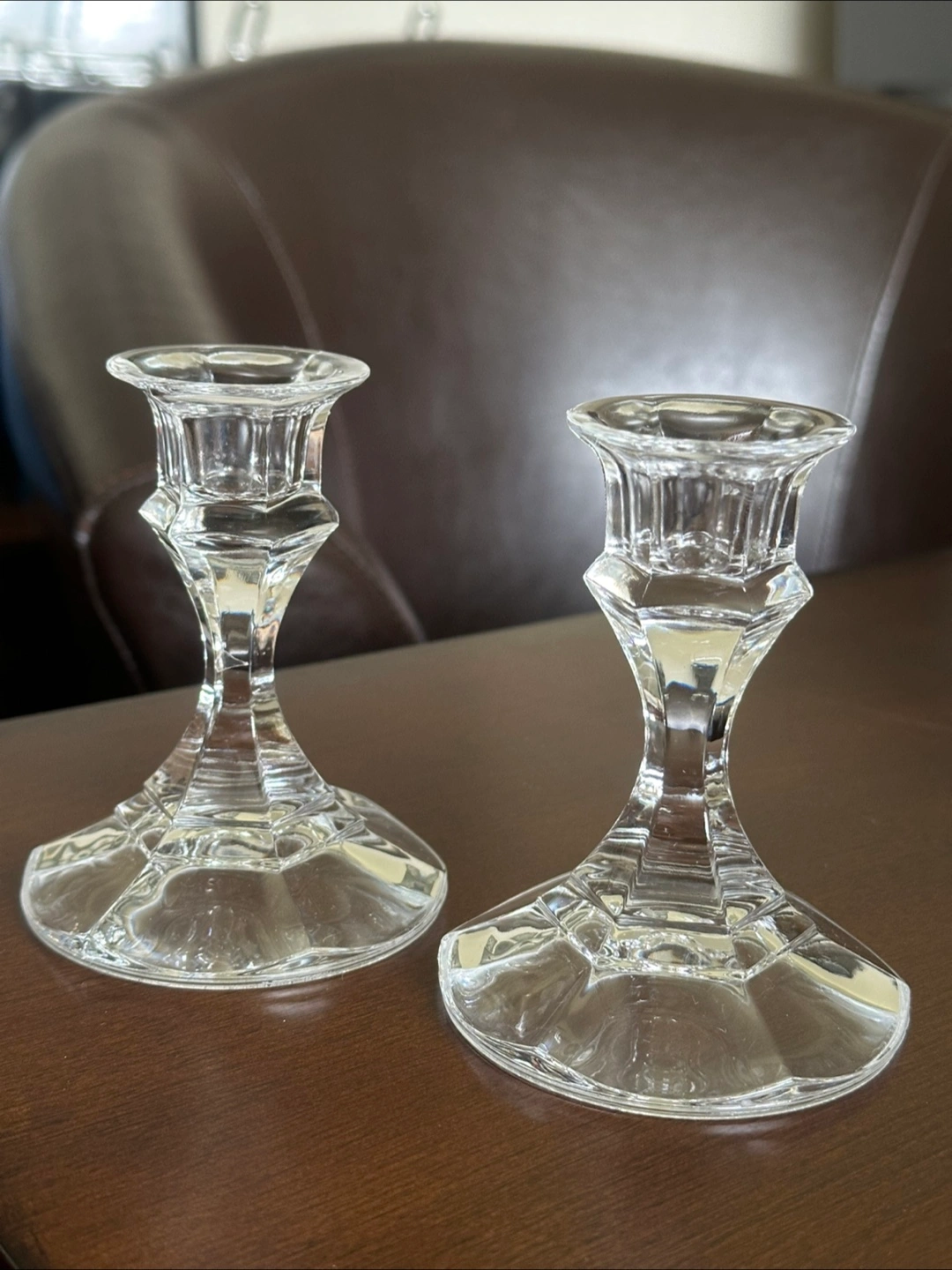 Elegant pair of clear crystal candle holders. Beautiful design, perfect for adding a touch of elegance to your home décor. Suitable for tapered candles.