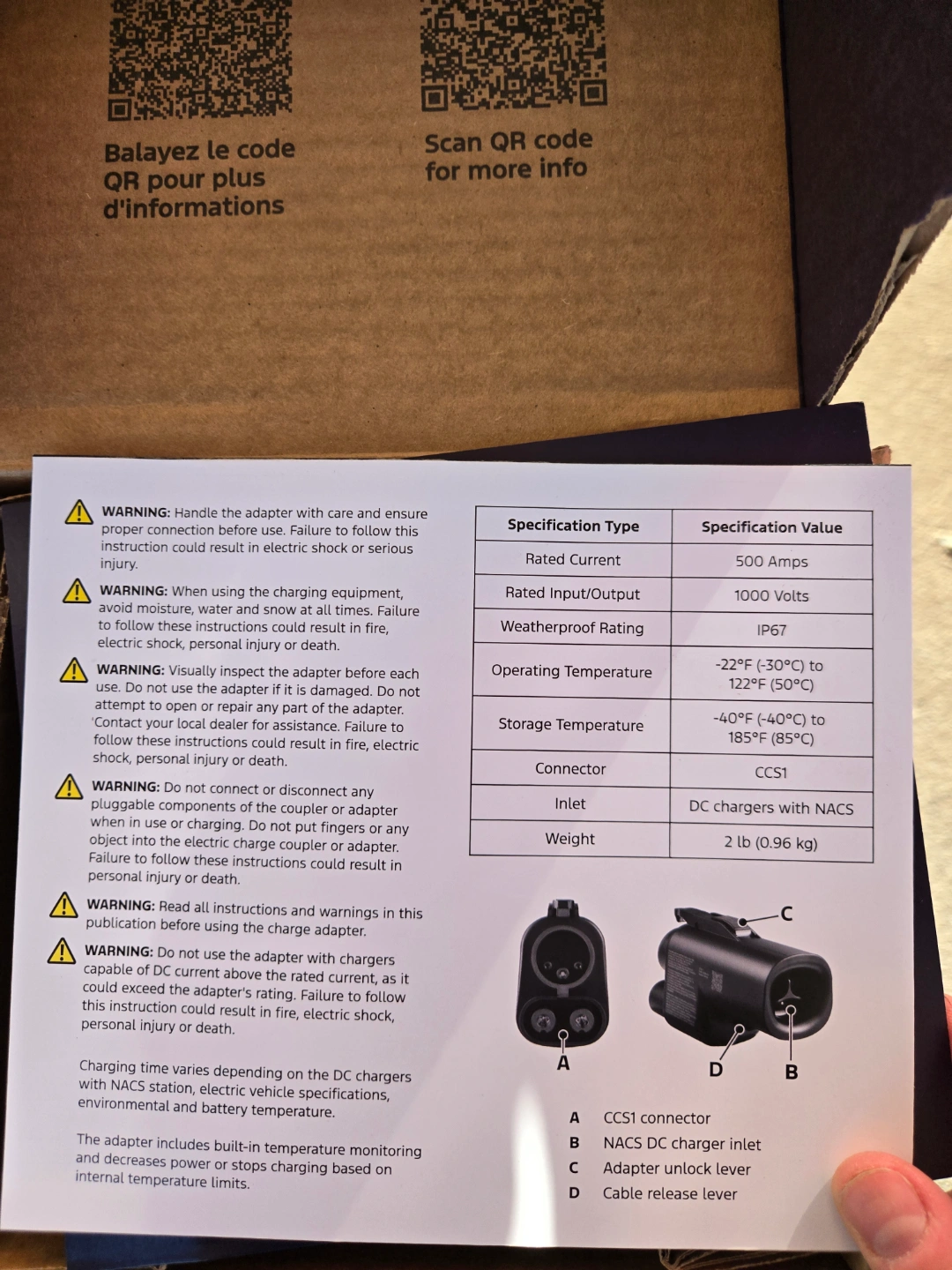 NACS to CCS1 charger adapter. New in box- never used. Check specifications in images. Weighs 2 lbs.Use it you can charge your EV of ford/Gm/chevrolet/Cadillac at Tesla supercharger