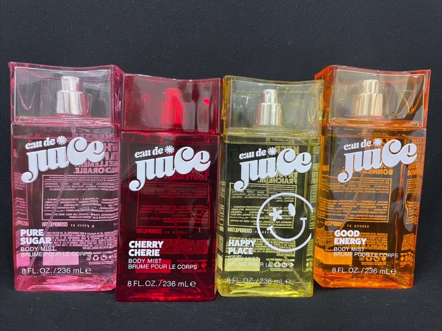 Brand new Four Eau de Juice body mists. Fragrances include Pure Sugar, Cherry Cherie, Happy Place, and Good Energy. 8 fl oz / 236 mL each. Price $14 each on website Selling price $15 for four mist./$5 each
