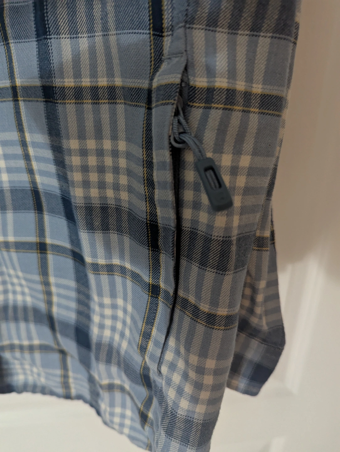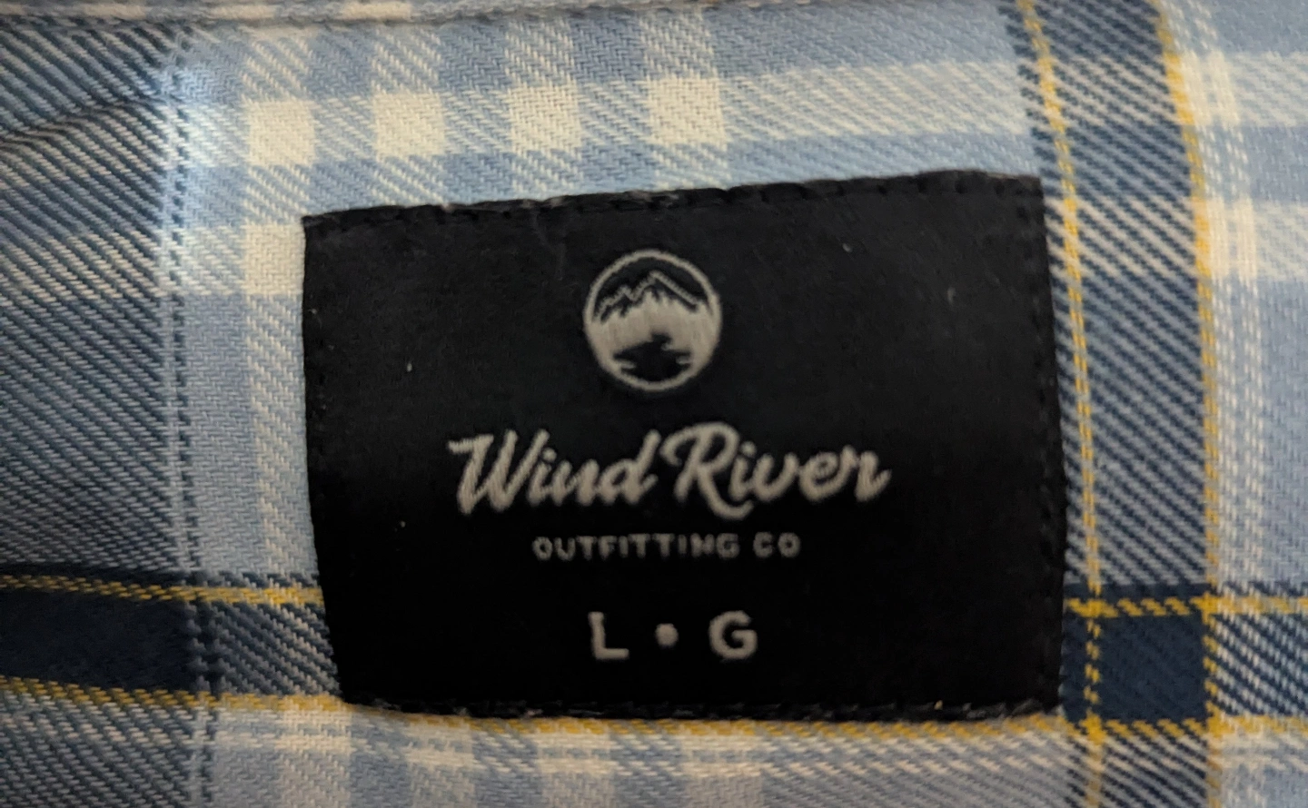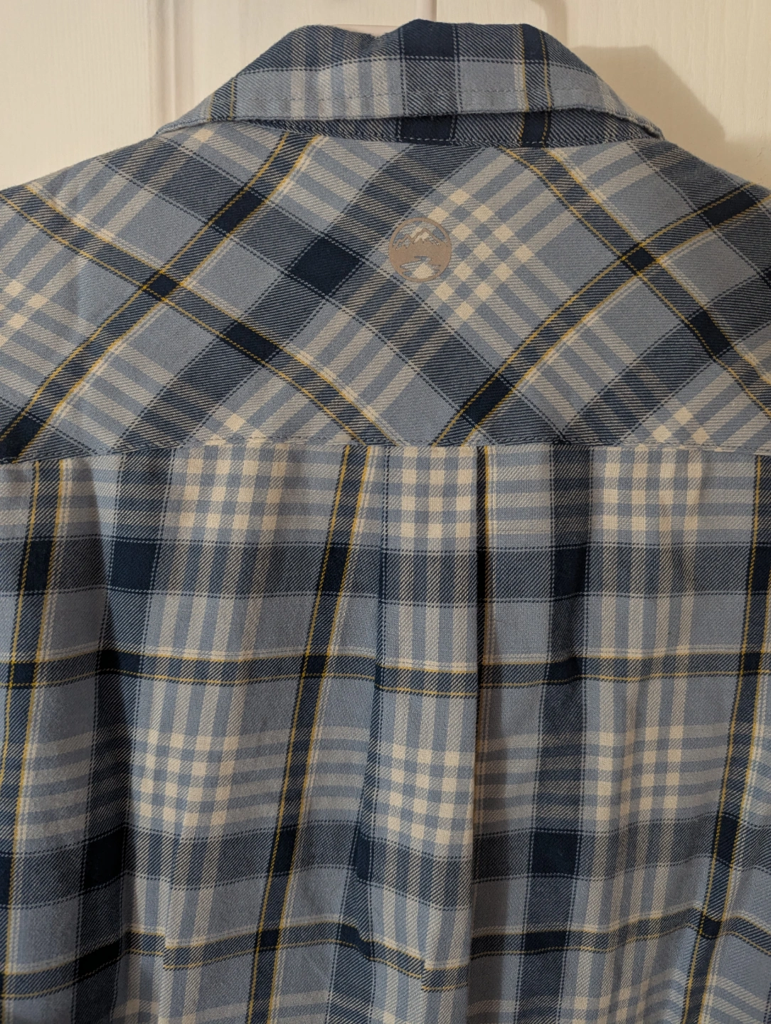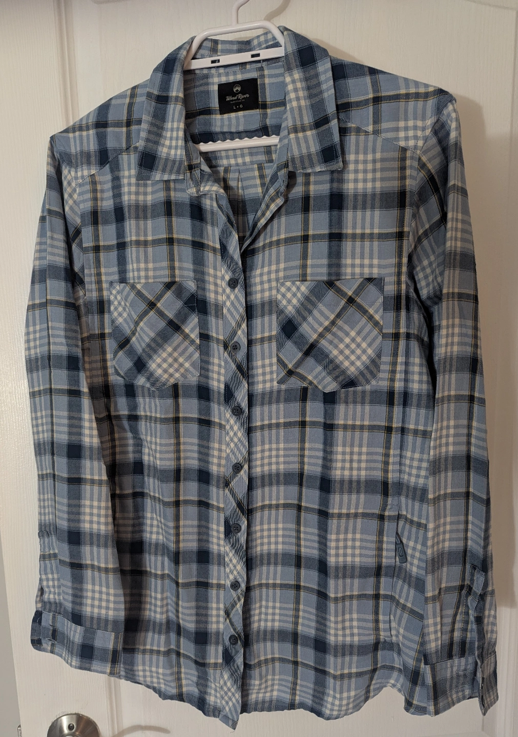 Women's long-sleeve button-up shirt. Blue, white and yellow plaid pattern. Two chest pockets. Size large. Great lightweight shirt if you have to wear long sleeves at your workplace