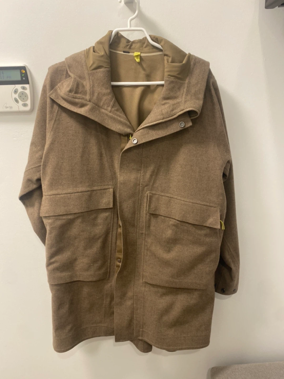 Lululemon Male mid-length parka jacket. It's made of a brown wool blend fabric. It has a hood and four front pockets.