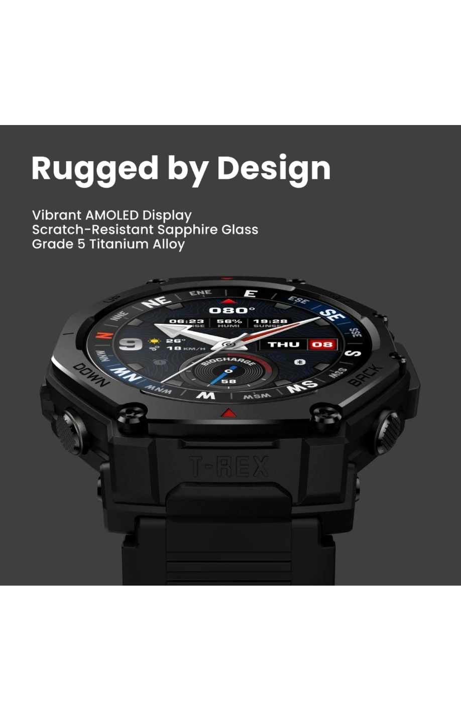 Rugged by Design: The T-Rex 3 Pro smart watch is adventure-ready with sapphire glass, a bright 3000-nit AMOLED display, and a titanium alloy bezel and buttons - available in 48mm or 44mm to match your style.