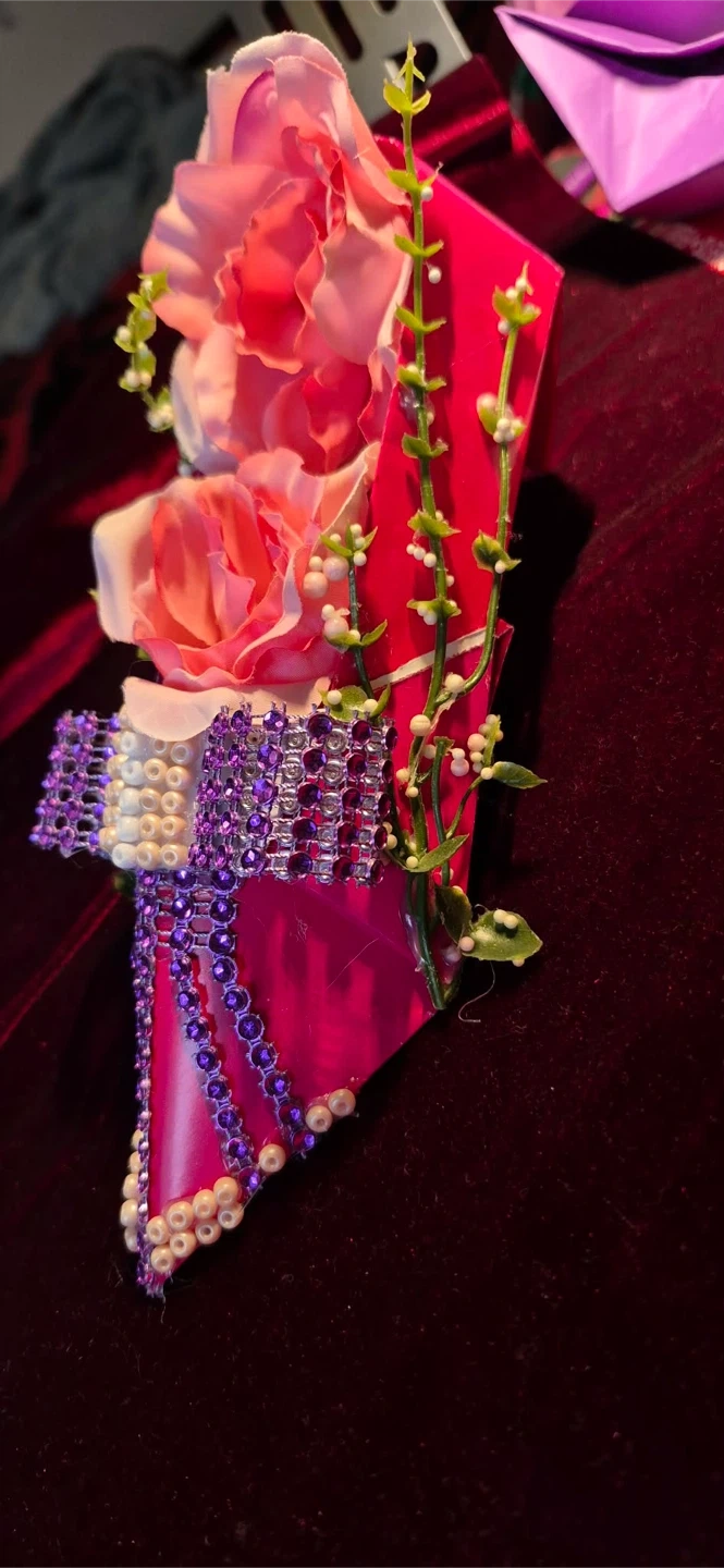 This is a decorative shoe clip with pink roses and purple beading. It features a bright pink base adorned with rhinestones and pearls. A fun accessory for any shoe!