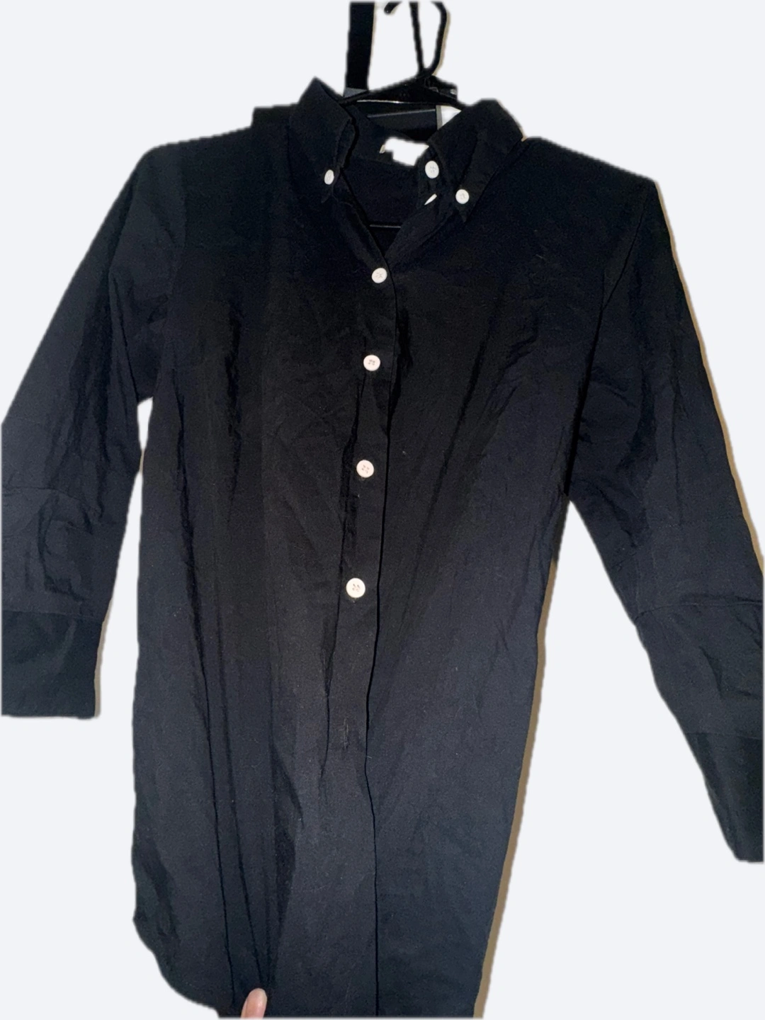 Long-sleeved black button-down shirt. Three-quarter length sleeves. Classic collar. Simple design. Good for layering or wearing alone.