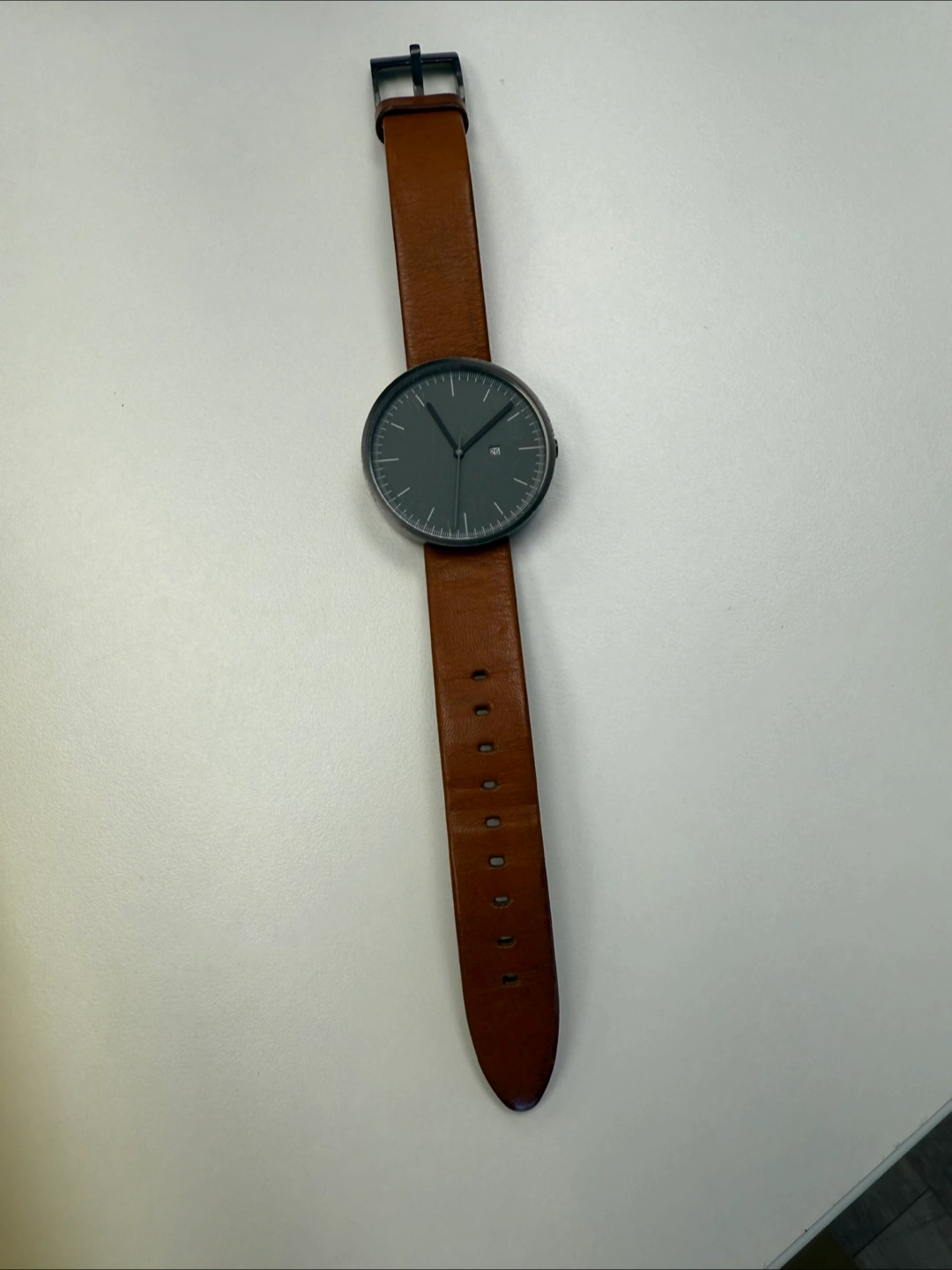Simple, elegant design. Dark grey face. Brown leather band. Analogue watch