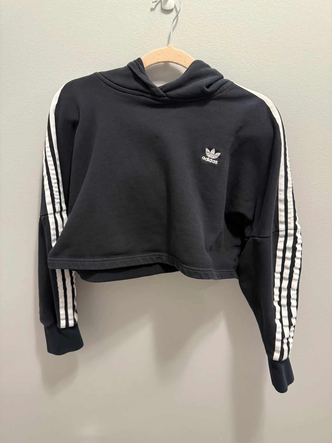 Black cropped hoodie. Adidas logo. Three white stripes on sleeves. Great for layering or wearing alone. Soft comfortable material.