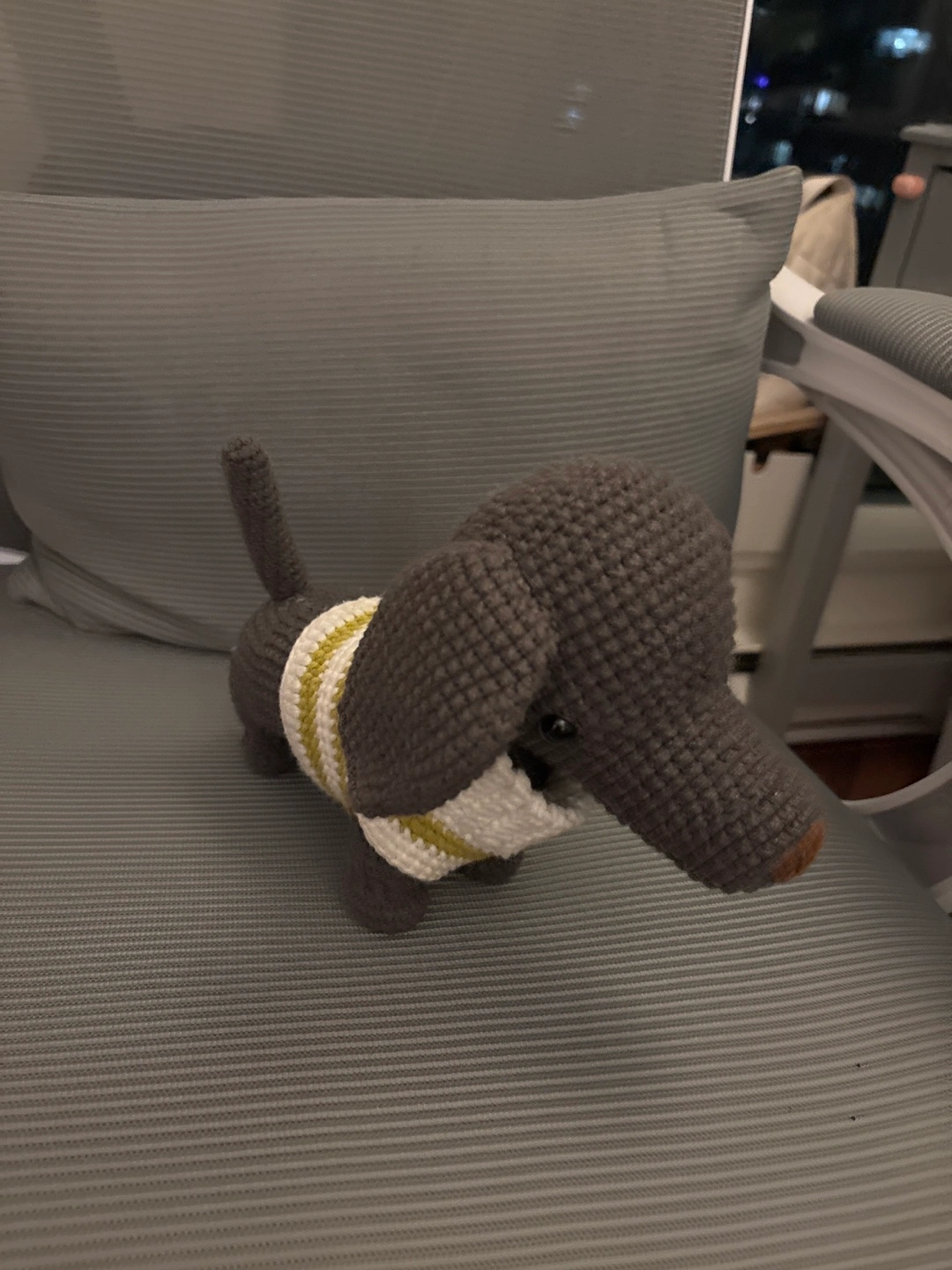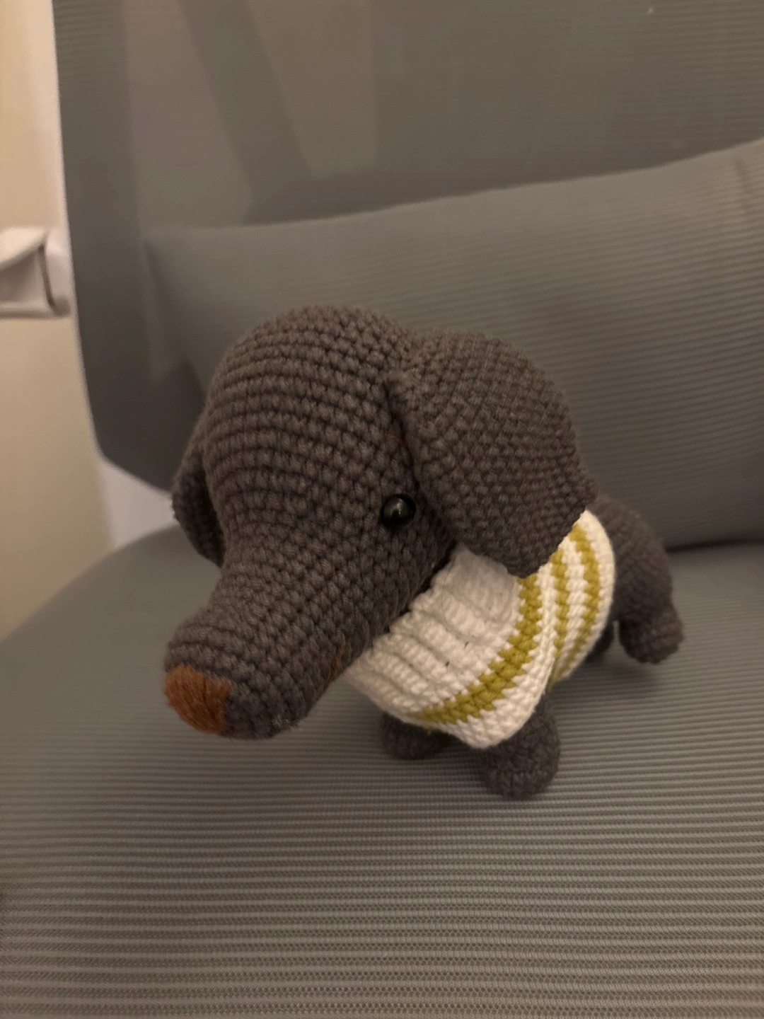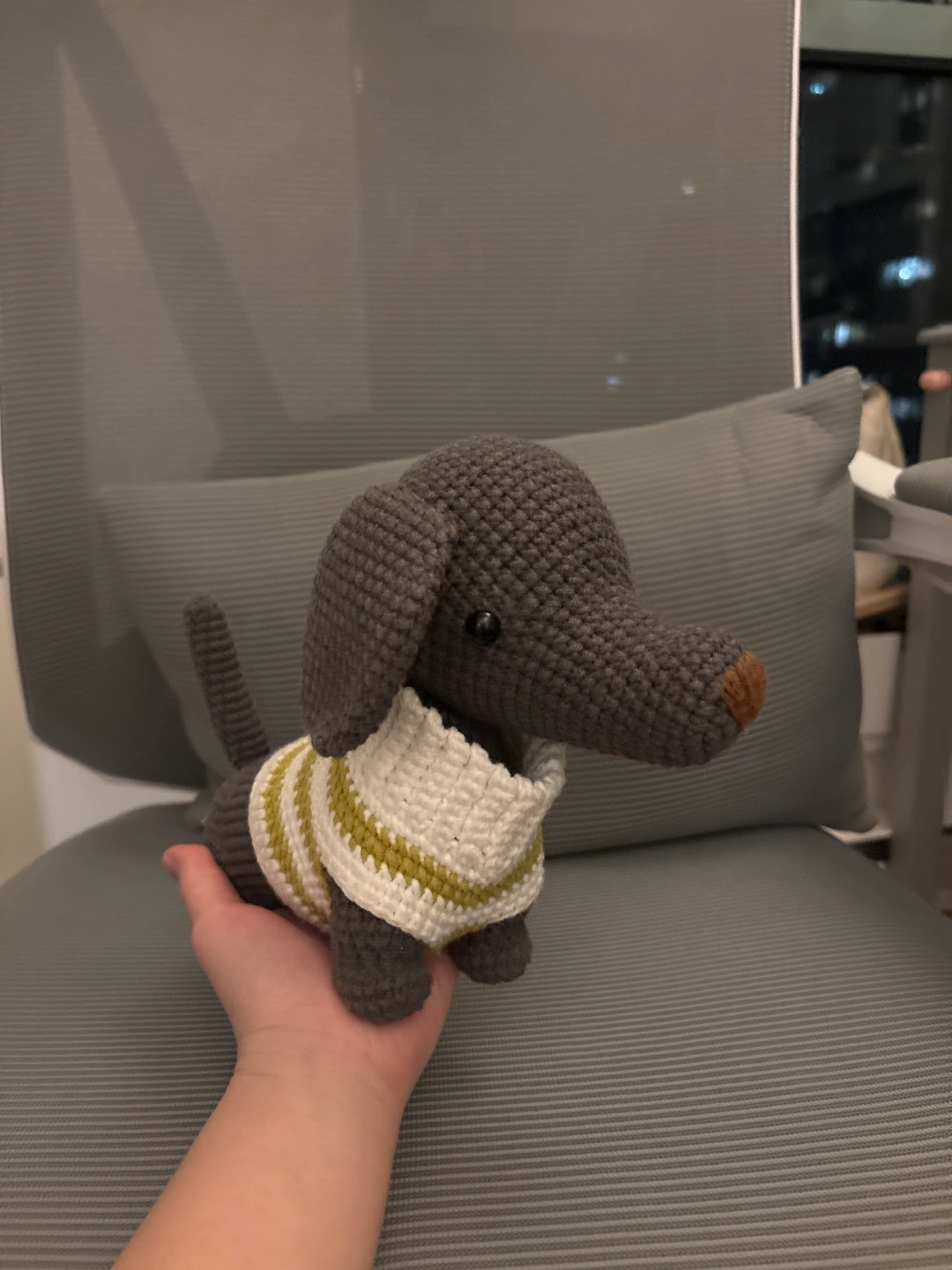 324Adorable crocheted dachshund wearing a sweater. Grey body with a cream and olive green striped sweater. Perfect gift or collectible. Price is negotiable! I just want it to go to a good home :)