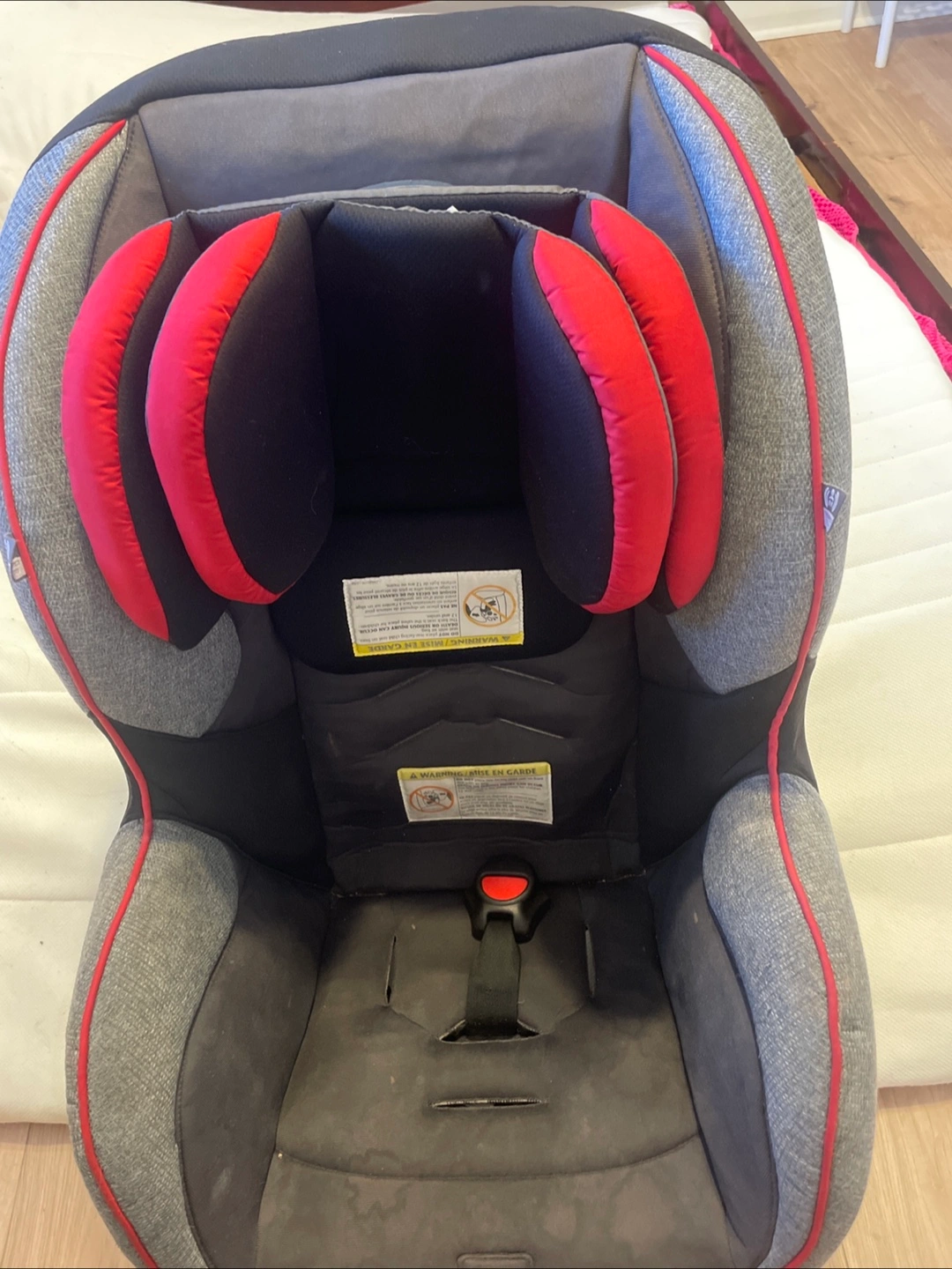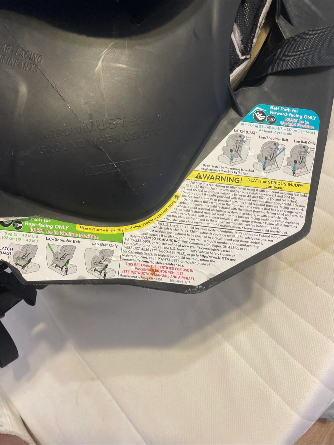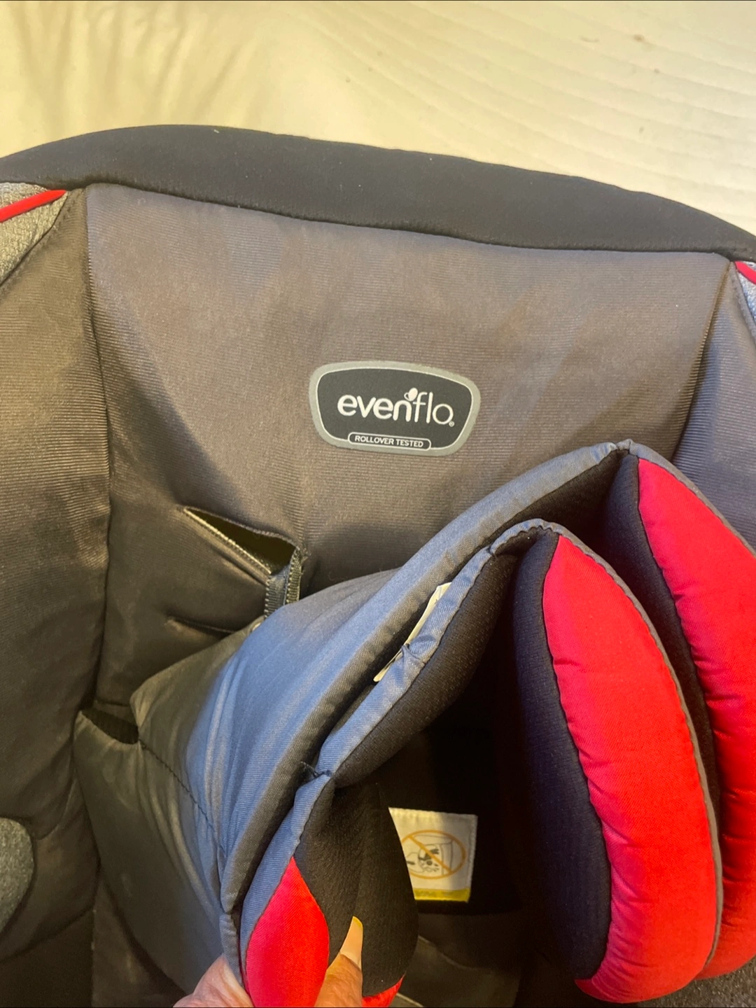 125Used Evenflo car seat. Grey and red. Features headrests. Suitable for forward and rear-facing. Check labels for weight and height restrictions.