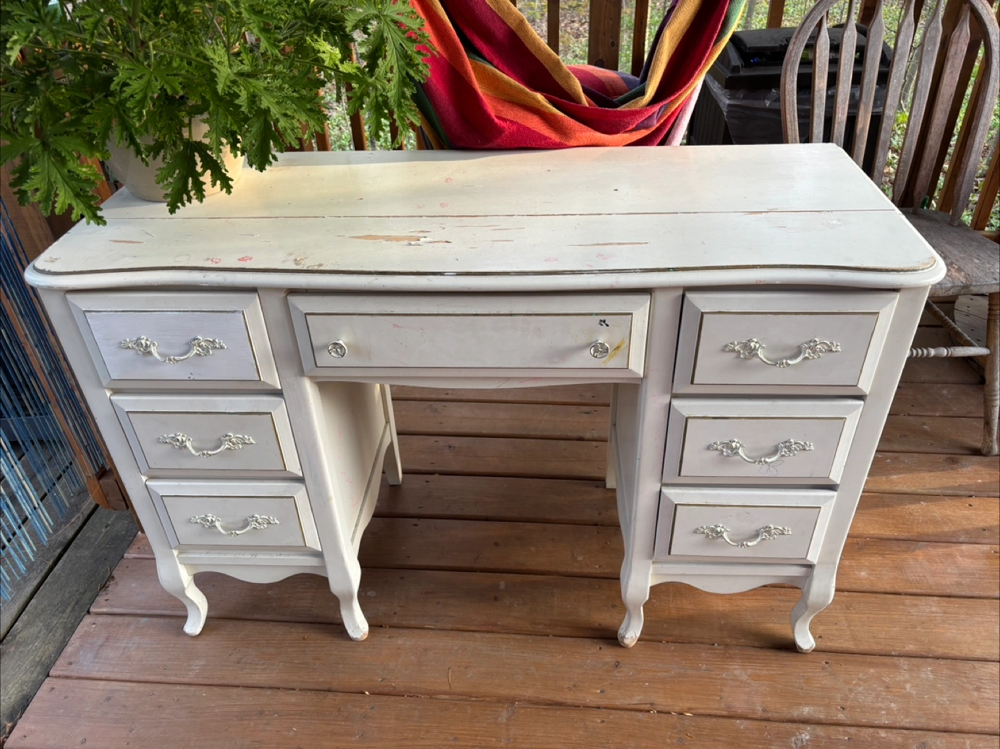 Nice vintage style set, includes a tall dresser and a vanity desk. Both pieces feature ornate detailing and light beige finish. Some wear and tear present. Great for a bedroom or home office. Well used but sturdy and a lot of life left in it