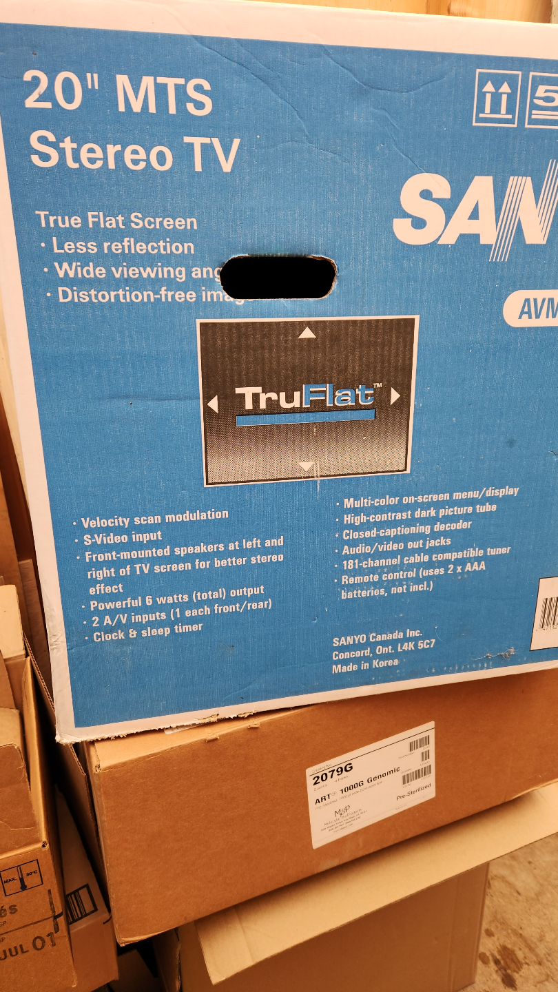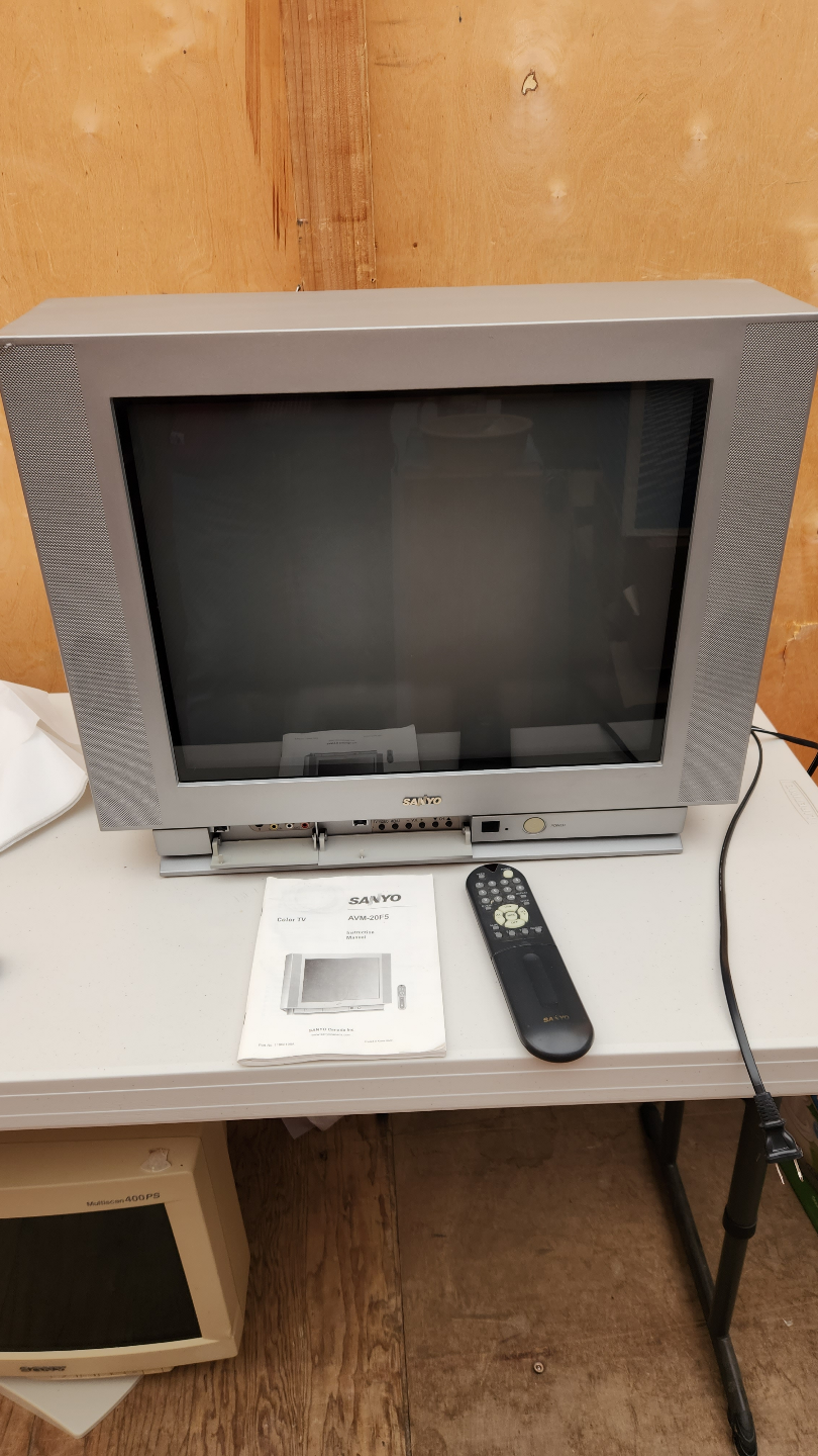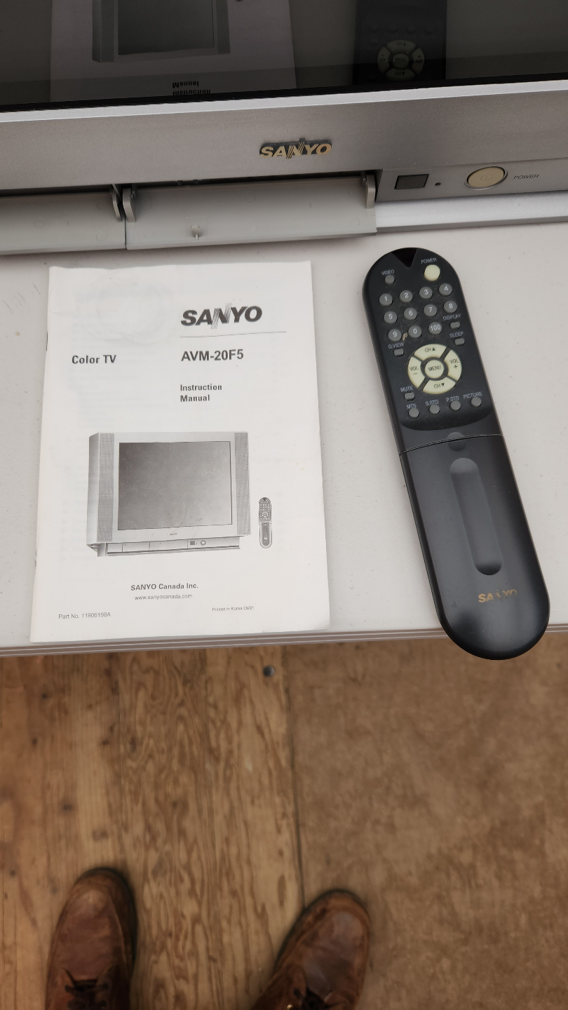 SANYO 20" TruFlat stereo TV. Includes remote and instruction manual. Model AVM-20F5. Features include velocity scan modulation, S-video, front-mounted speakers, and more. Will be dropping at recycle center tomorrow morning, so act fast if interested. Thanks for looking.