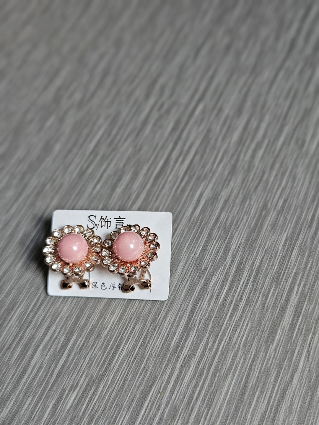 92Pretty pink flower clip-on earrings. Rose gold tone metal. Rhinestone accents. Perfect for adding a touch of elegance to any outfit.