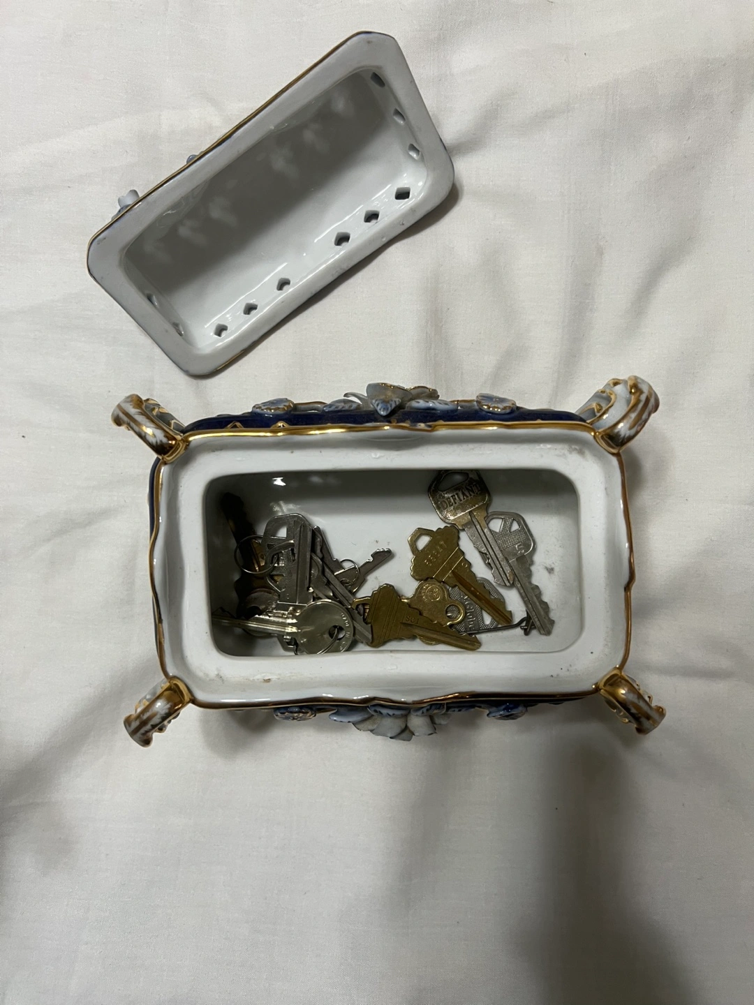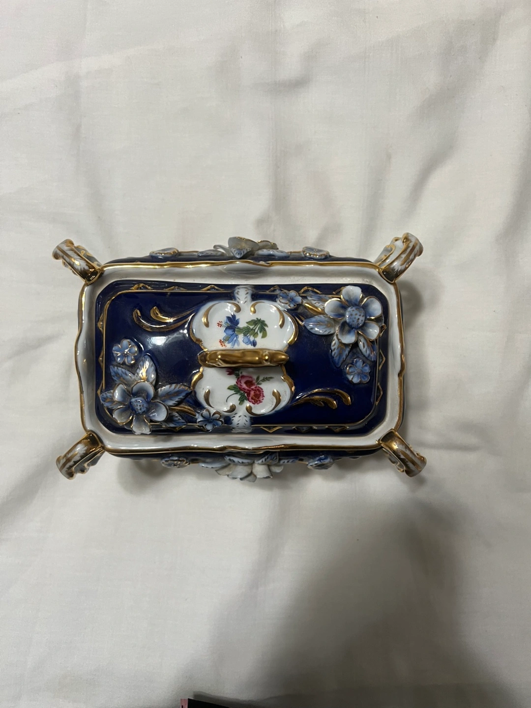Ornate porcelain trinket box. Blue and white floral design. Gold accents. Four legs. Lidded. Small size. Perfect for keys or jewelry.