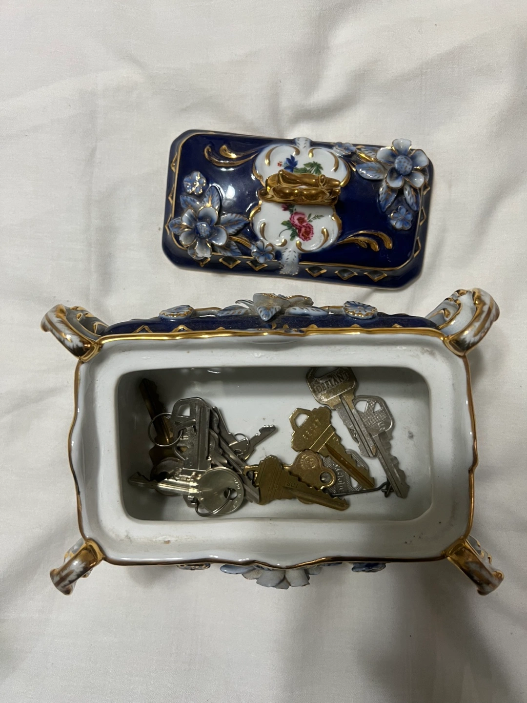 Ornate porcelain trinket box. Blue and white floral design. Gold accents. Four legs. Lidded. Small size. Perfect for keys or jewelry.