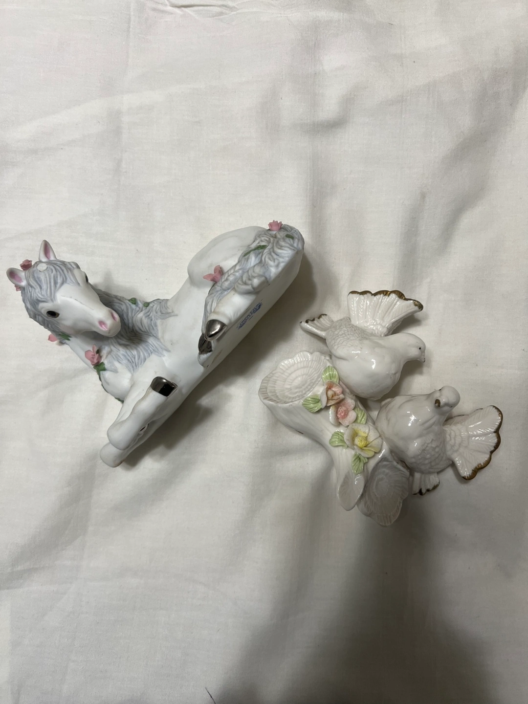 Adorable set of two porcelain figurines. One depicts a horse adorned with flowers, the other features two doves perched on a floral branch. Collectible and charming.
