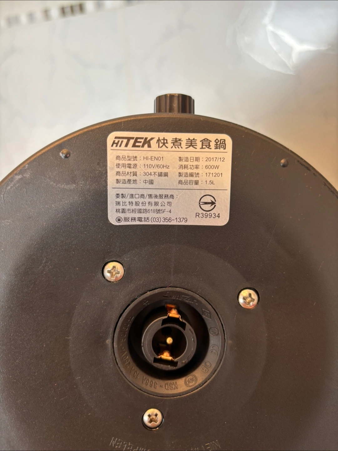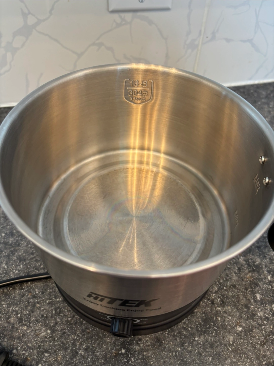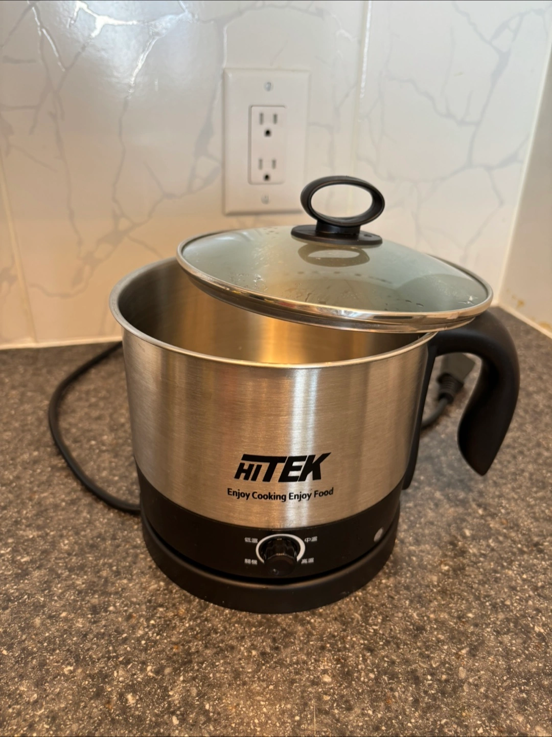 Stainless steel cooking pot. Black base with simple controls. Glass lid. Cord included. 1.5 litre capacity.