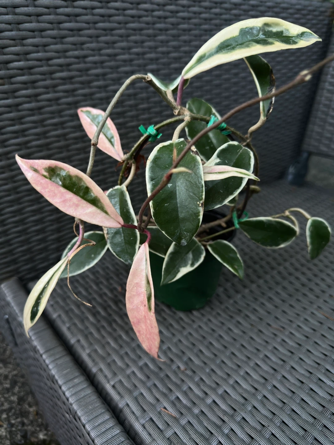 32Hoya - Krimson Queen (Tricolor) The leaves are either pink or white to creamy white around the leaf edges, The mature plant and flowering are shown in Figure 2 as reference. 4’ inch pot.
