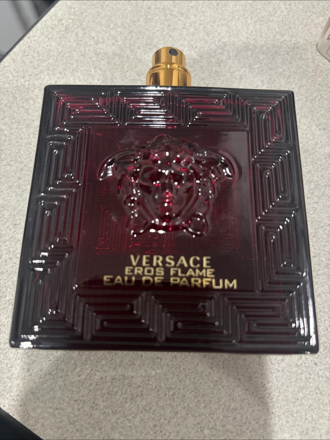 Eau De Parfum in a dark red bottle. Features gold accents and a Medusa head emblem. Square shaped bottle.