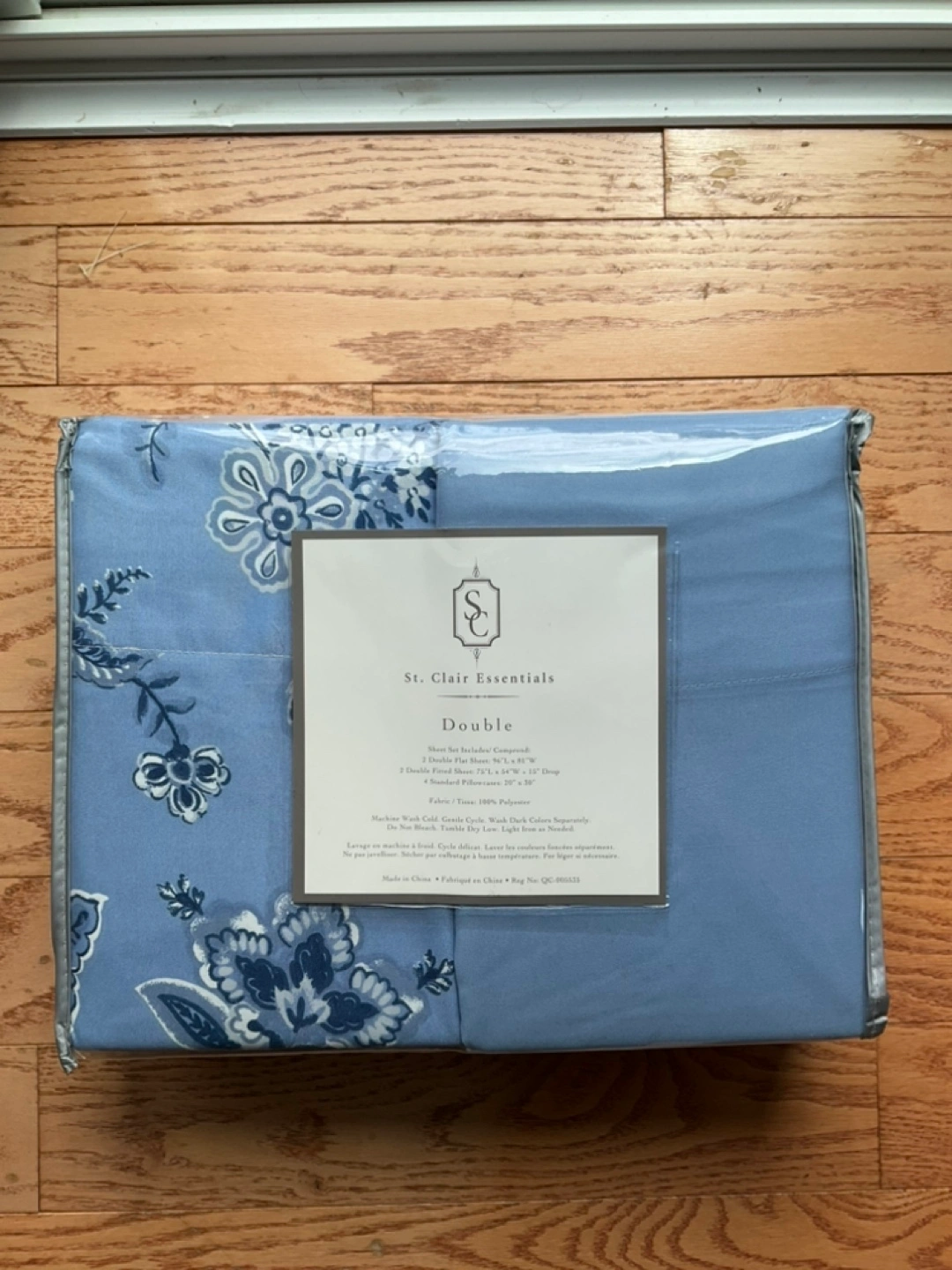 1 set of solid blue sheets and 1 set of paisley blue sheets. Each pattern has a fitted sheet, flat sheet and 2 pillowcases. Totalling 8 pieces of bedding. Mix and match on your beds. 100% polyester.