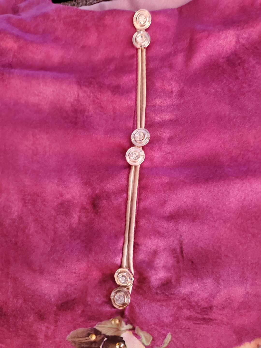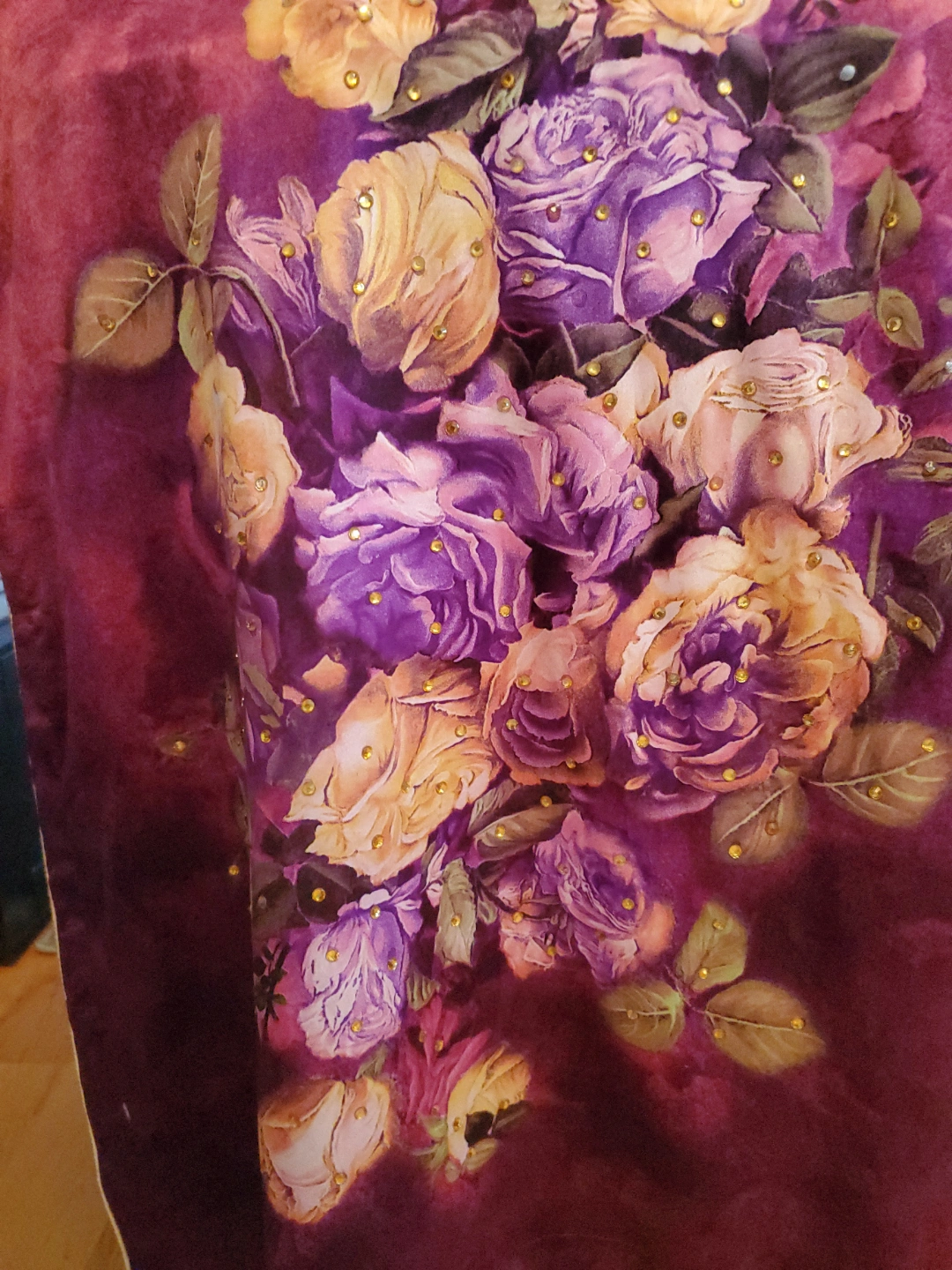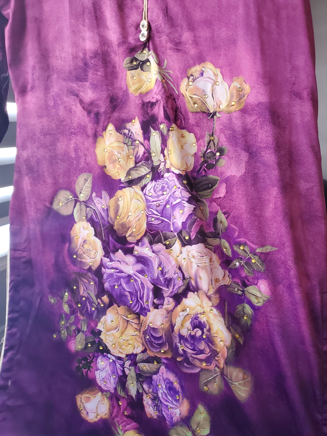 Beautiful purple floral Kurti or Shalwar Kameez. Size large. Features rhinestone accents. Long sleeves. Three-quarter length. Unique design.