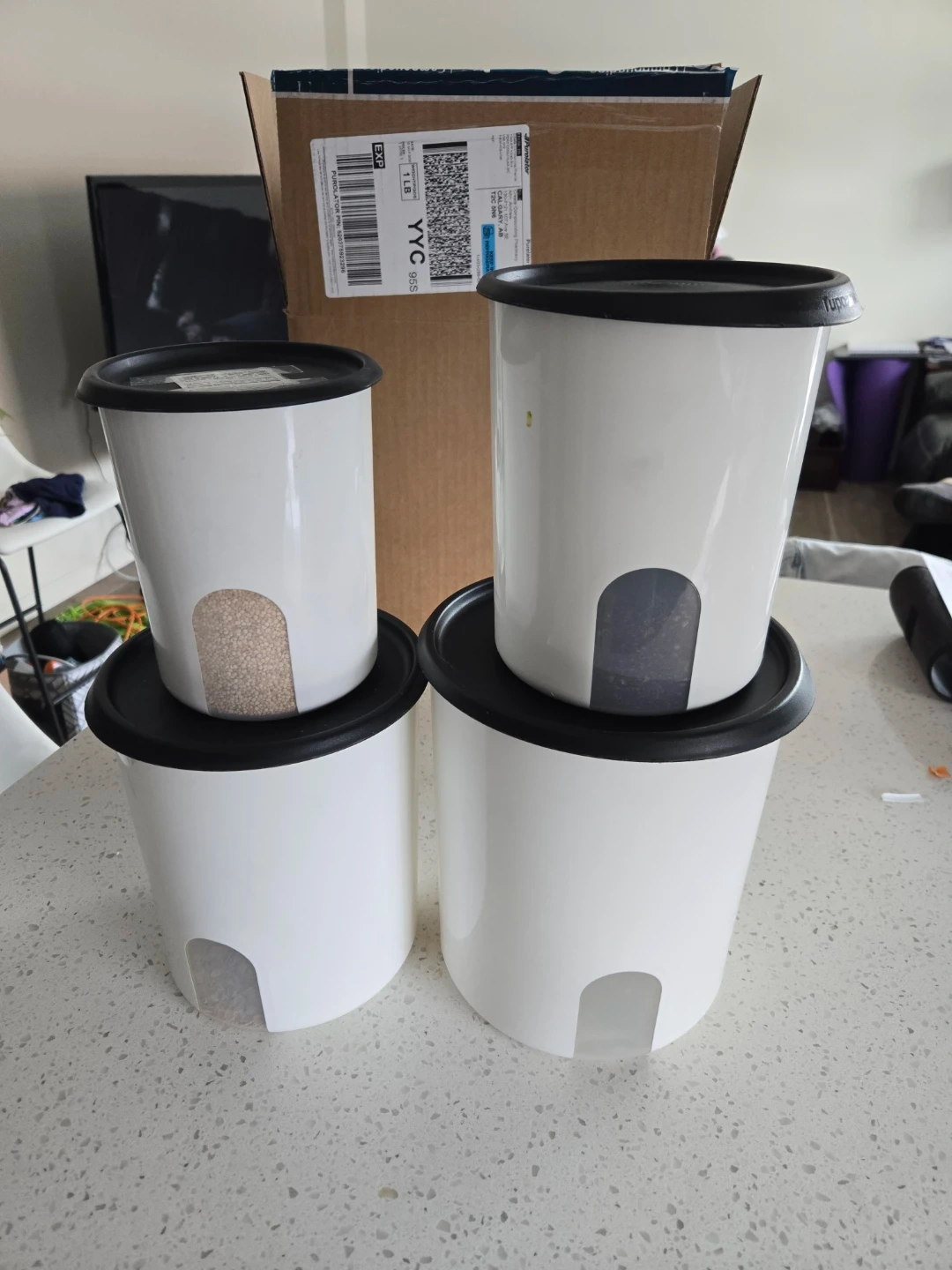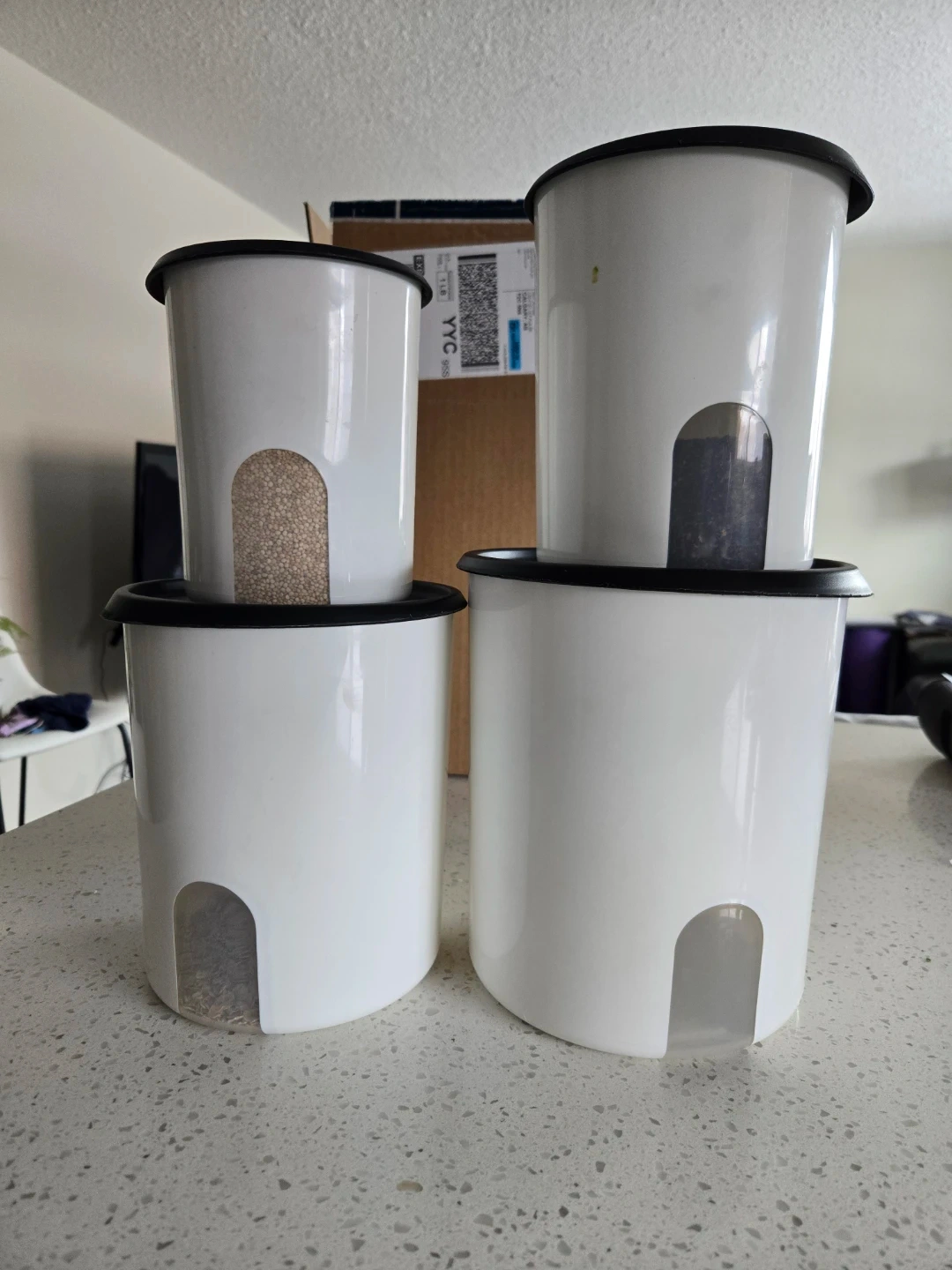 This set includes four white Tupperware food cannisters with black lids. They're perfect for keeping dry goods fresh. Each container has a clear window to see the contents.