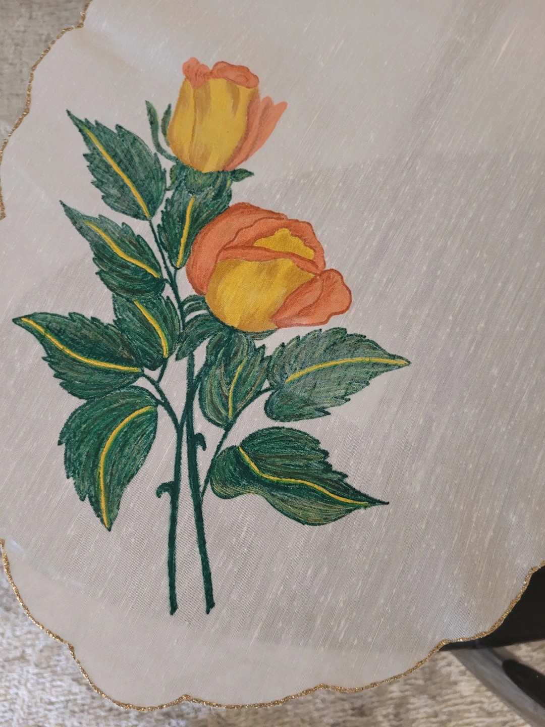 HAND MADE PAINTED Two lovely placemats. Off-white fabric with embroidered rose design. Scalloped edges with gold trim. Perfect to use it as a tray mat or table runners