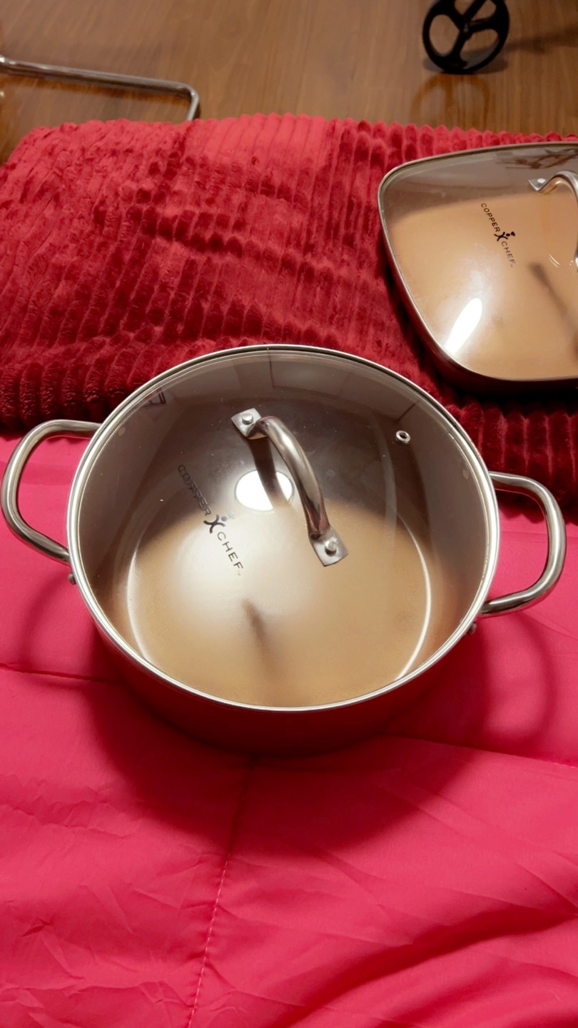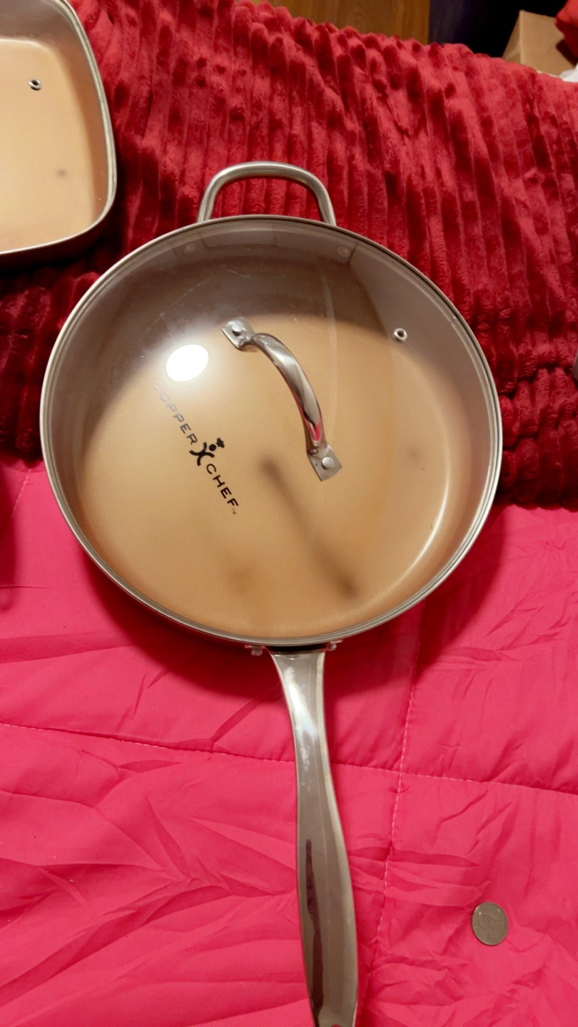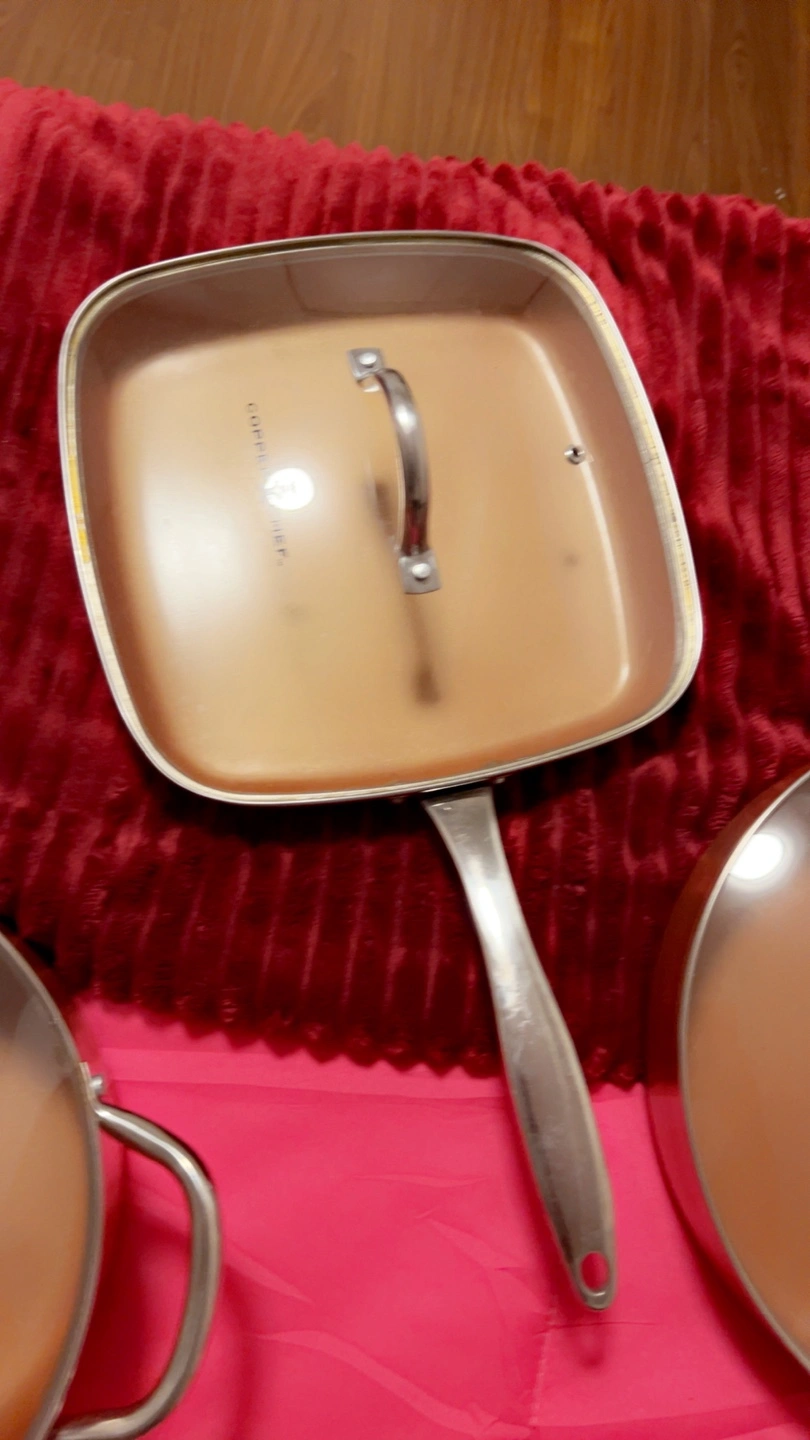 Copper Chef cookware set. Includes frying pan, saucepan, and square pan. All feature glass lids. Stainless steel handles. Great for everyday cooking. Never used