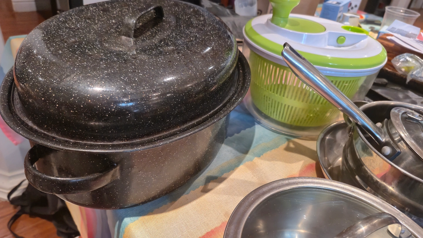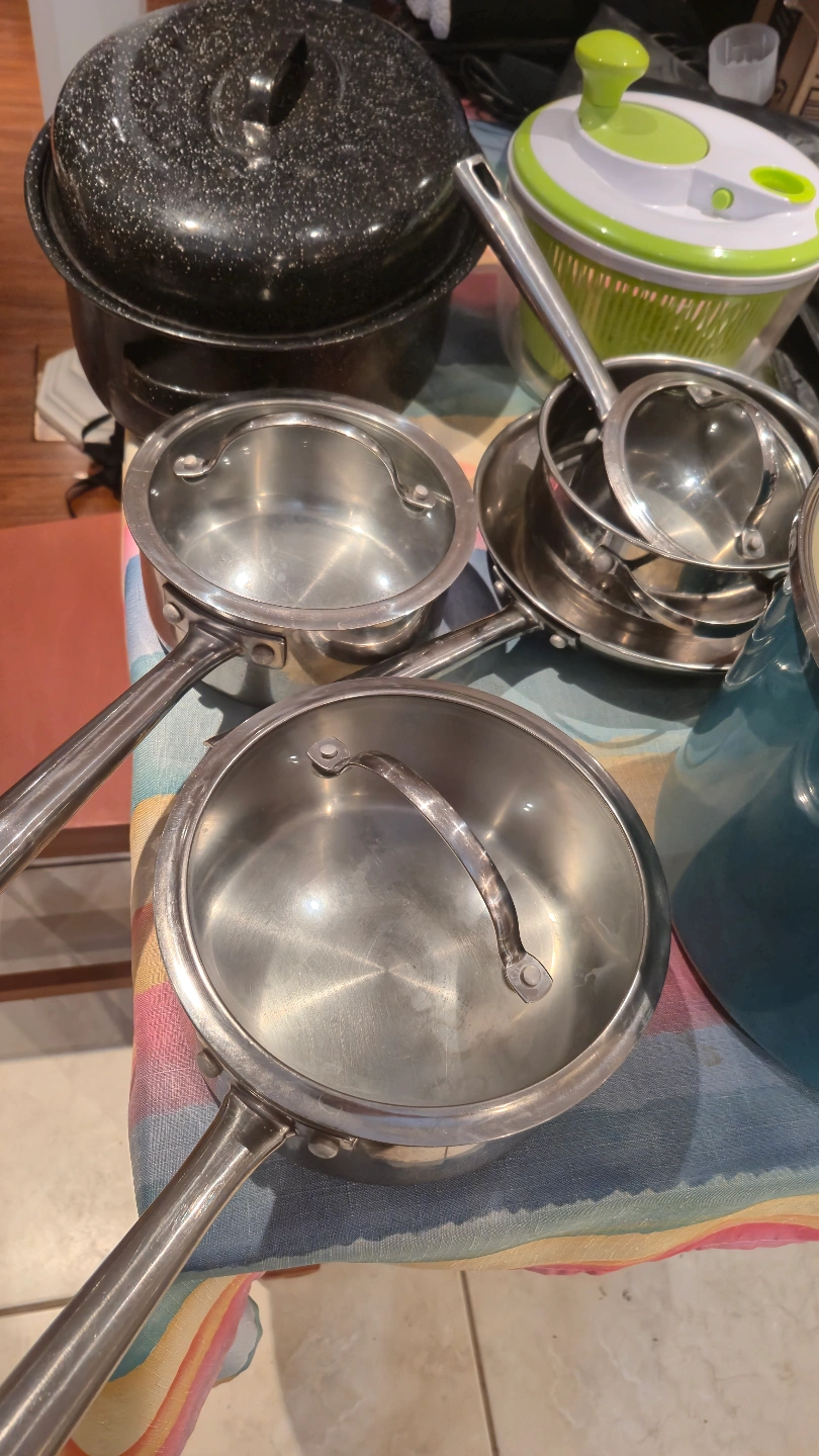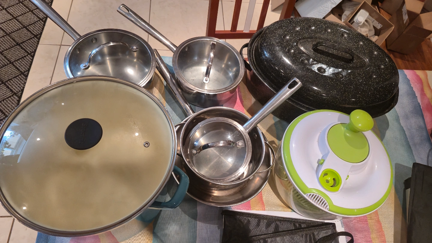 Large assortment of pots and pans. Includes stainless steel saucepans with lids, a speckled black roasting pan, and a teal enamelled pot. Great for everyday cooking. (14 kitchen items, all in good condition)