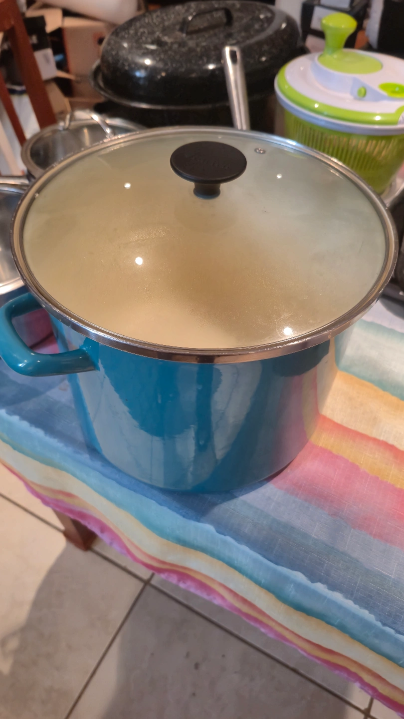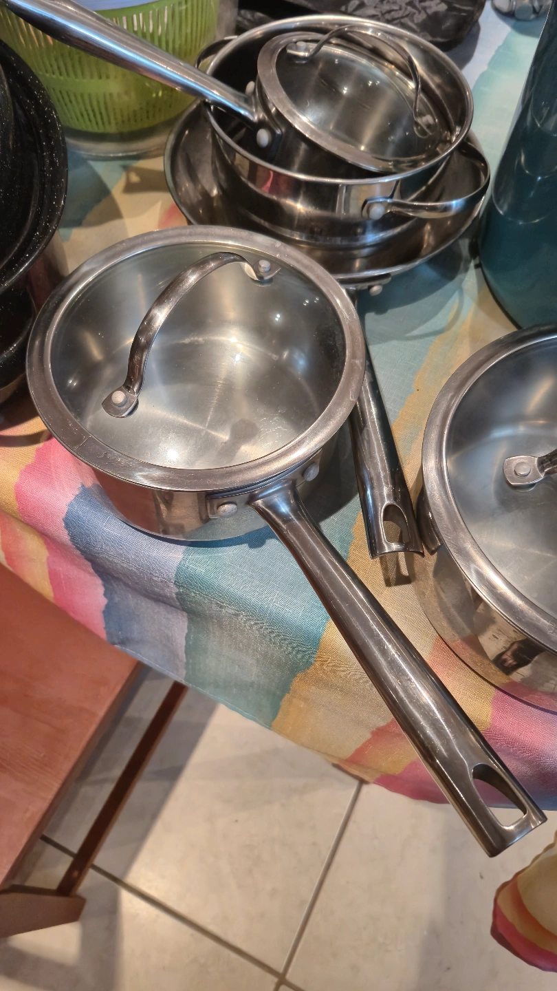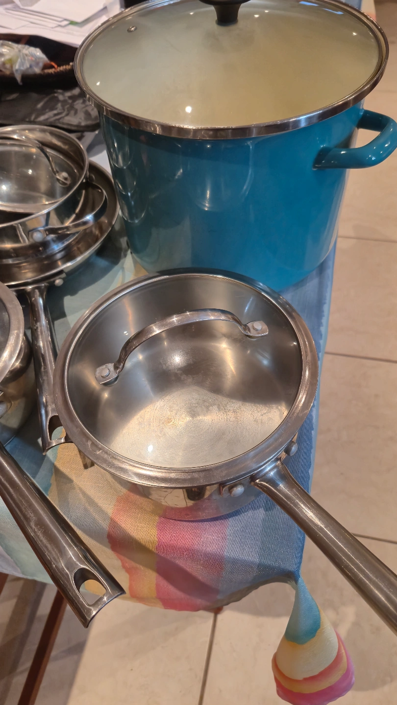 Large assortment of pots and pans. Includes stainless steel saucepans with lids, a speckled black roasting pan, and a teal enamelled pot. Great for everyday cooking. (14 kitchen items, all in good condition)
