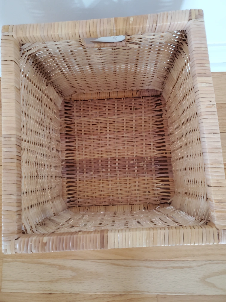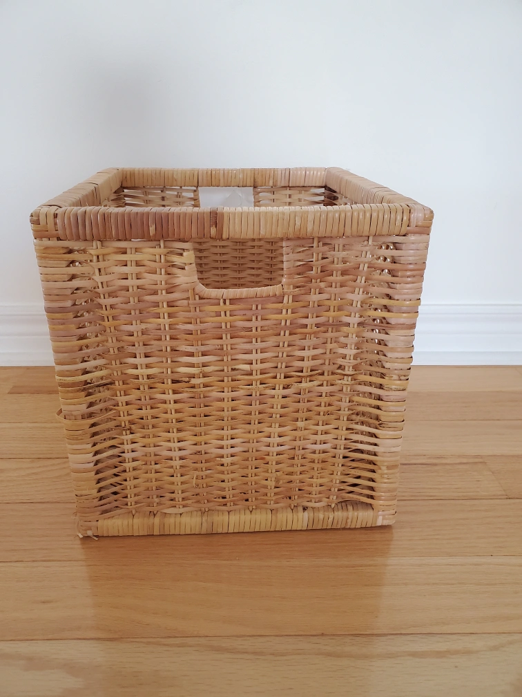 Square-shaped wicker basket. Natural light brown colour. Perfect for storage or organization. Good condition.