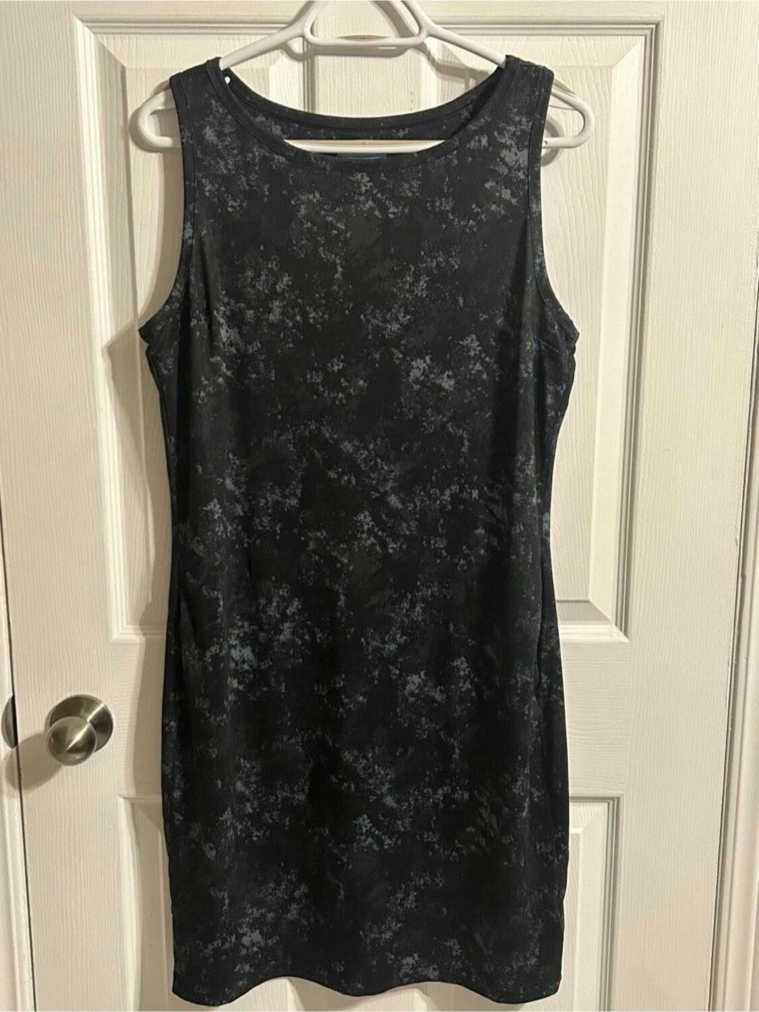 Black and grey sleeveless sundress. Made in Indonesia. Size L/G. 89% polyester, 11% elastane.