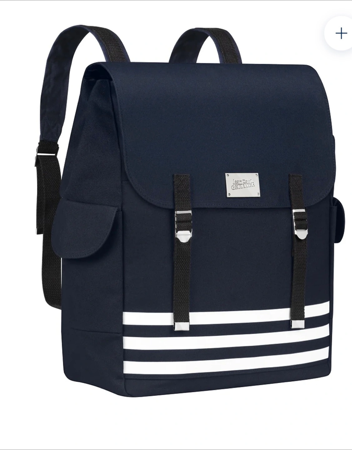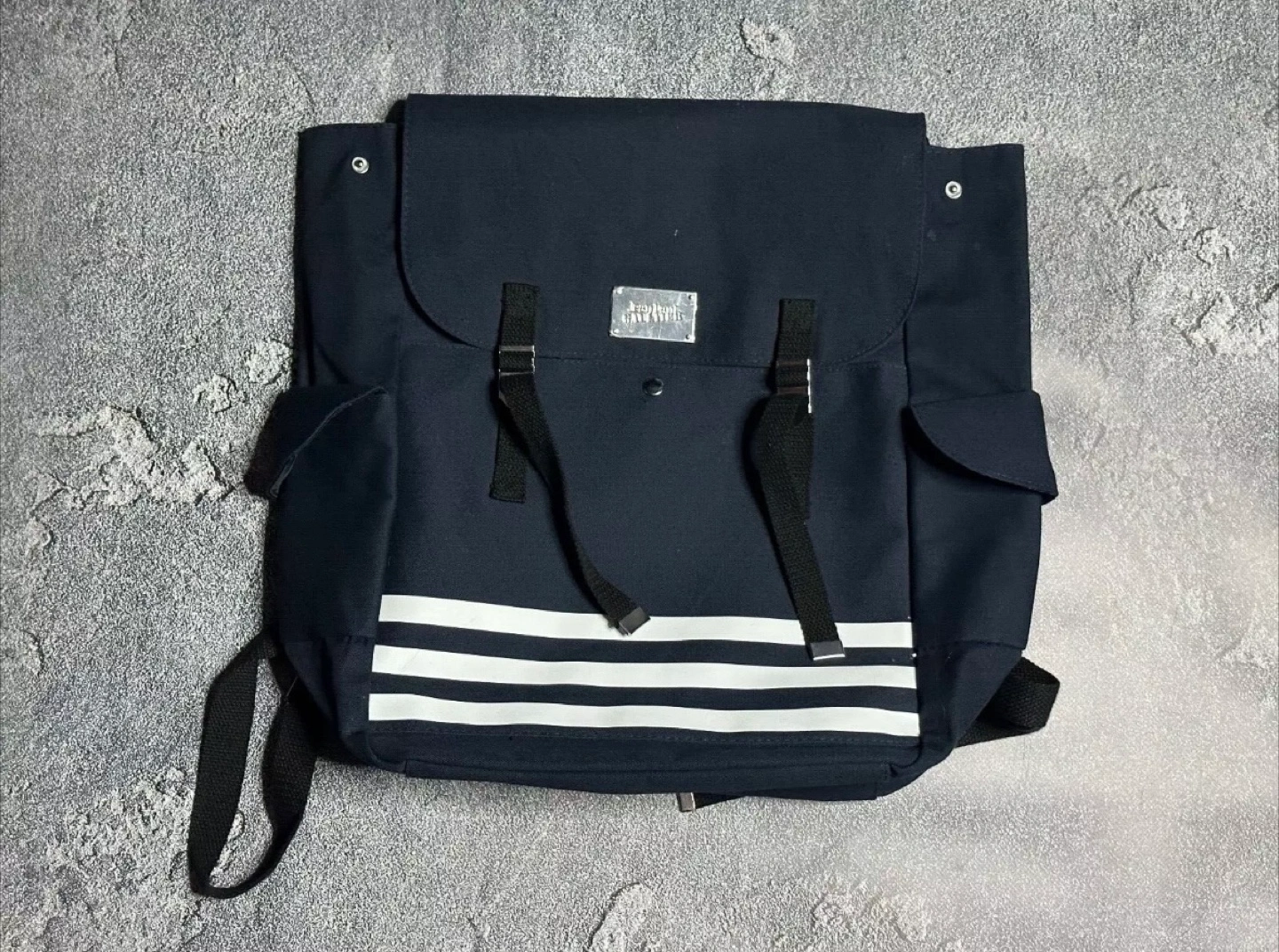 Dark navy blue canvas backpack. Features three white stripes across the bottom. Metal Jean Paul Gaultier logo plate. Adjustable straps. Flap closure with buckles. Small side
