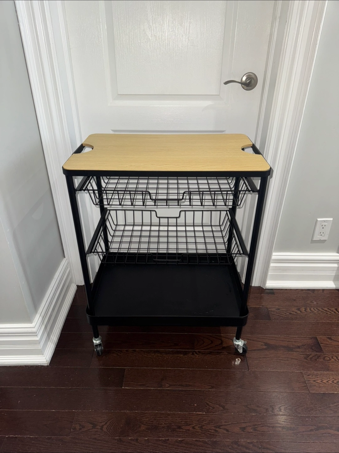 Three-tiered rolling kitchen cart. Features a wooden top and wire baskets. Perfect for kitchen organization or storage.