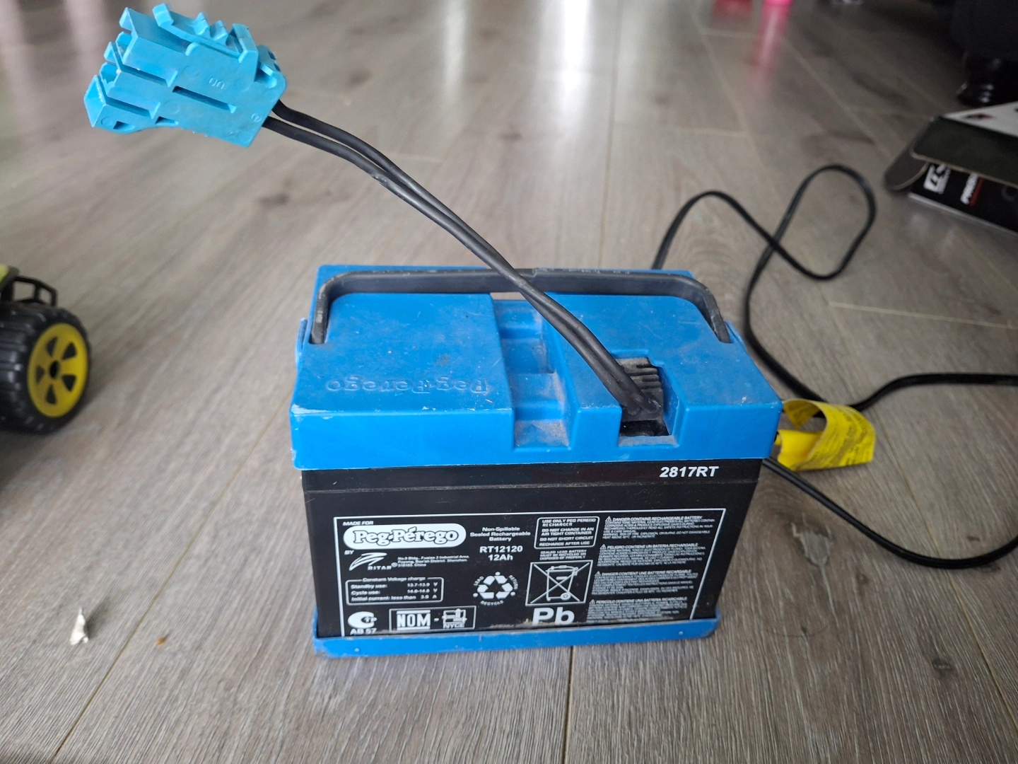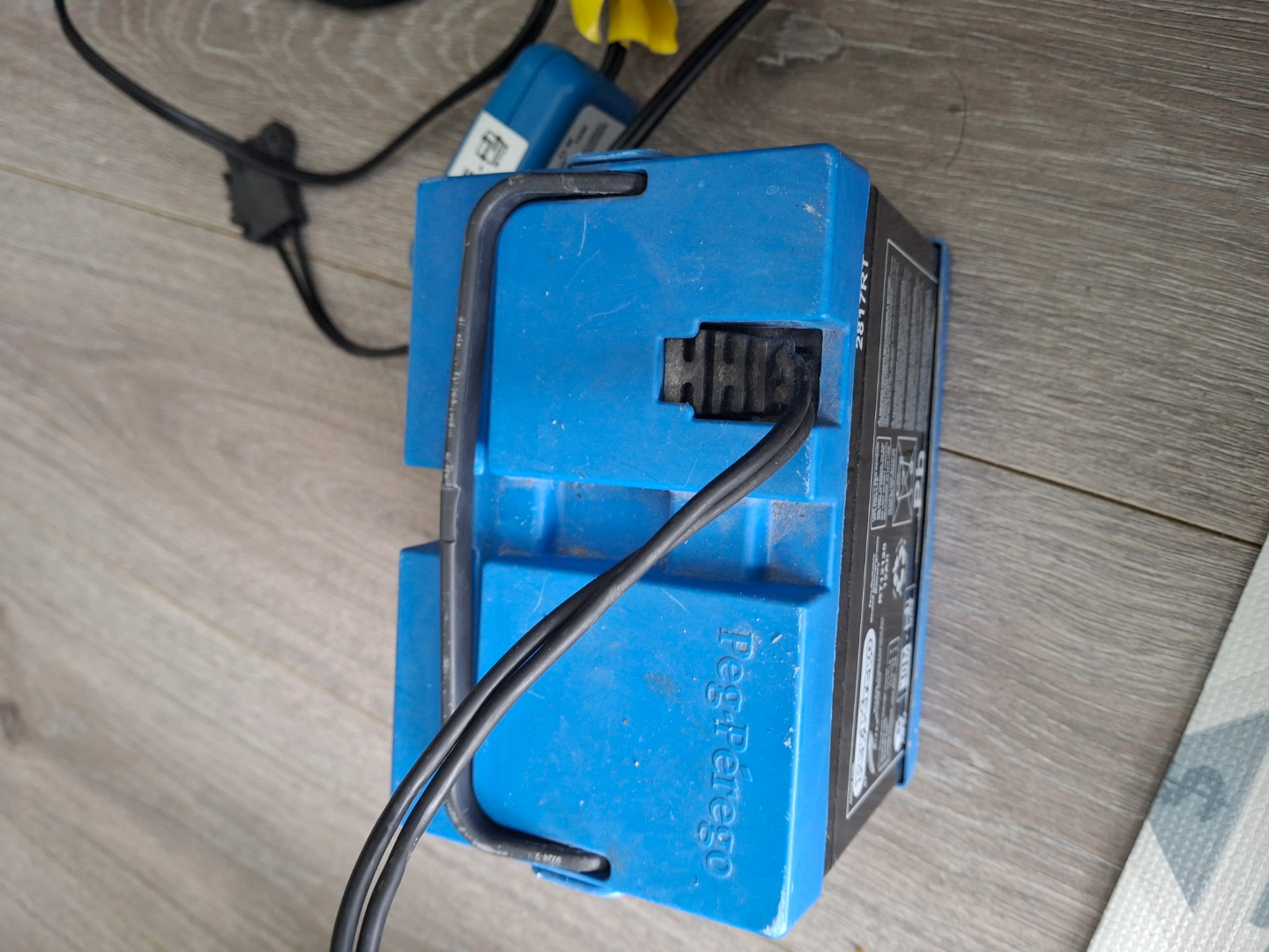 Used Peg Perego 12V rechargeable battery. Includes charger. Model RT12120. Part number 2817RT. Good condition, some minor cosmetic wear.