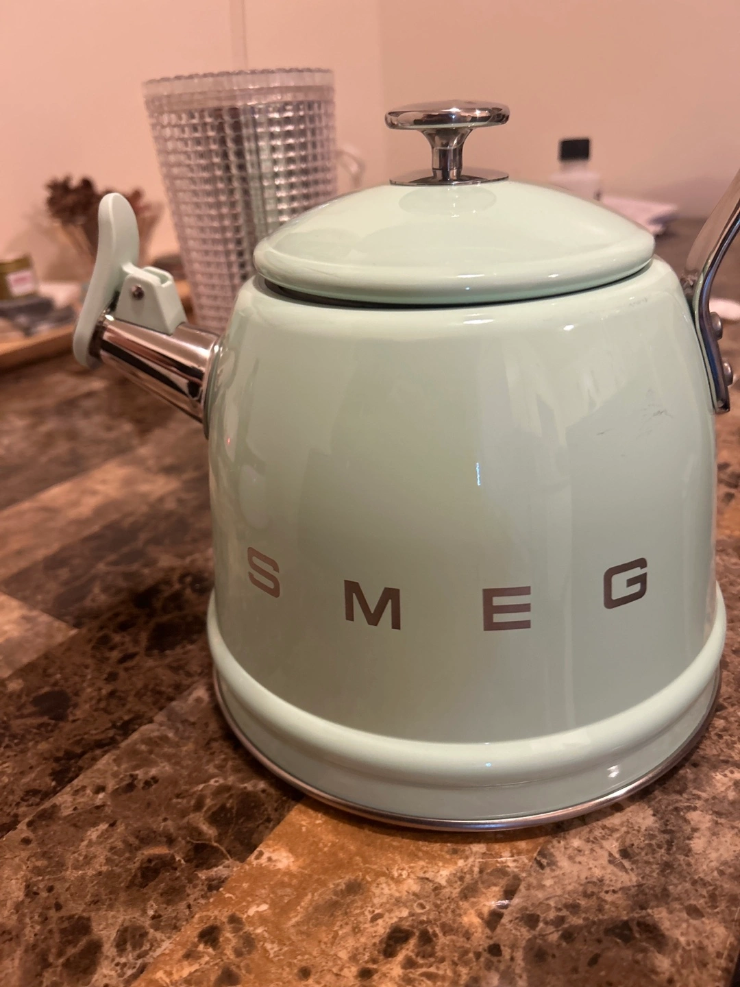 18Beautiful pastel green kettle. Features a metallic silver handle and lid. Elegant design, perfect for any kitchen.