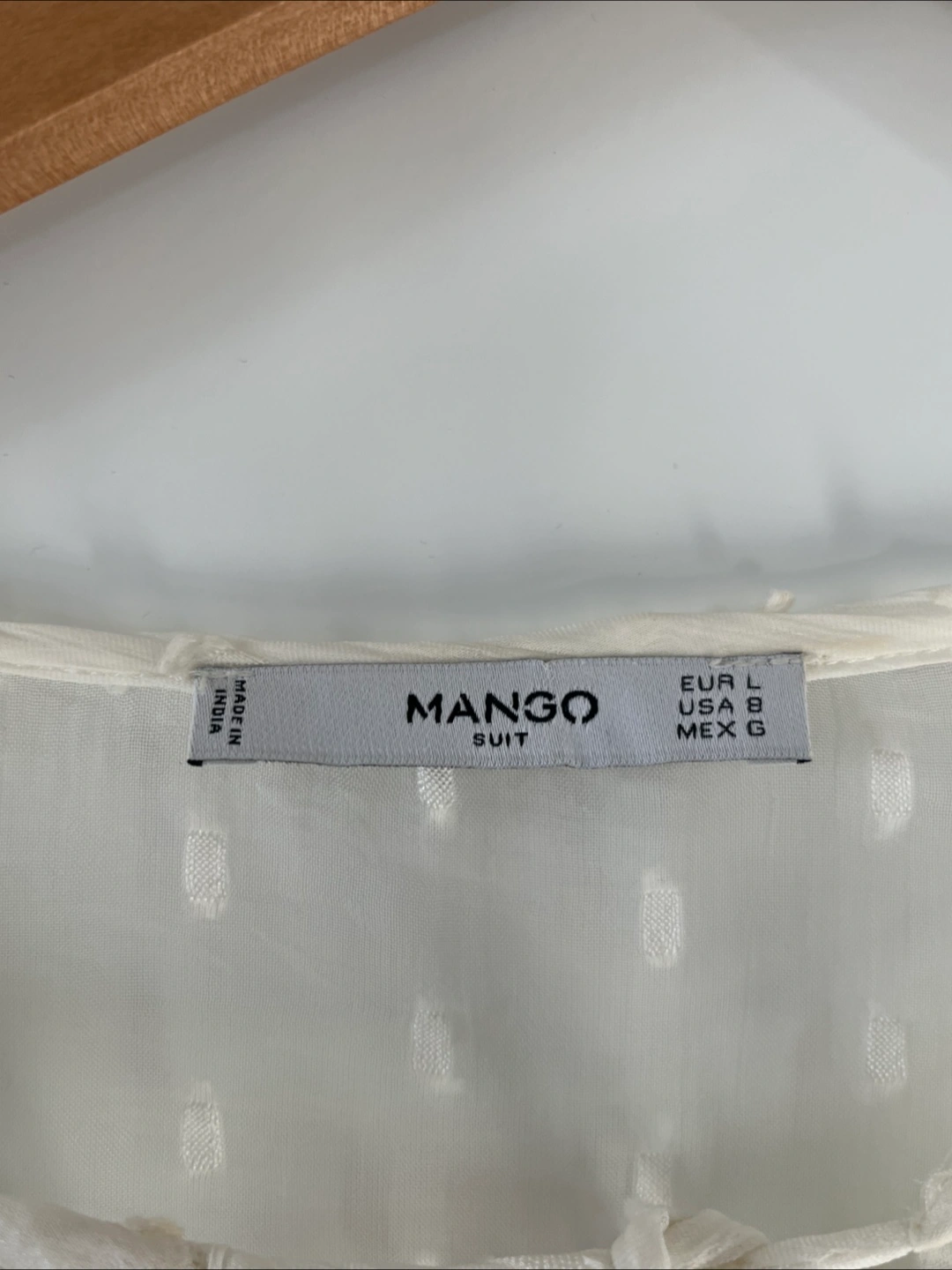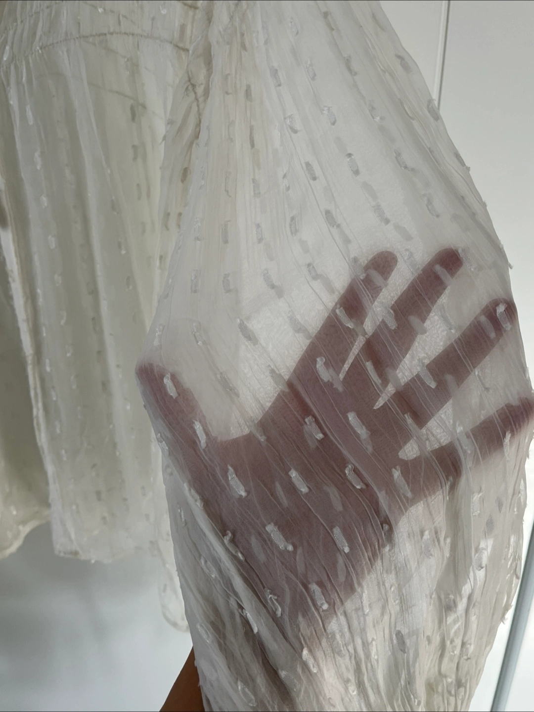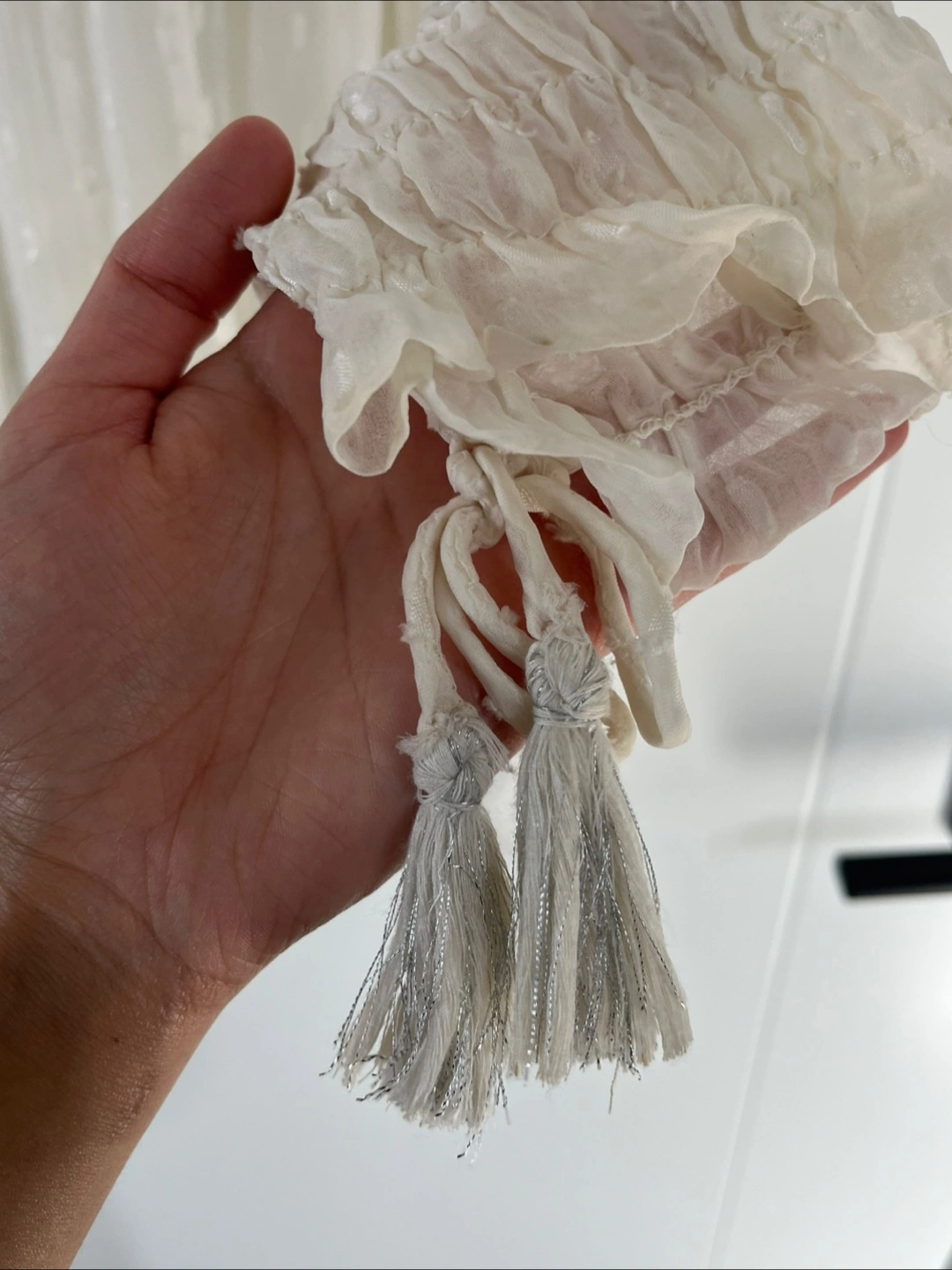 Off-white sheer blouse form mango suit, the premium line at Mango. So comfortable to wear because it’s pure silk. But it has some makeup stains on it that I didn’t try cleaning and missing one tassel in the front tie