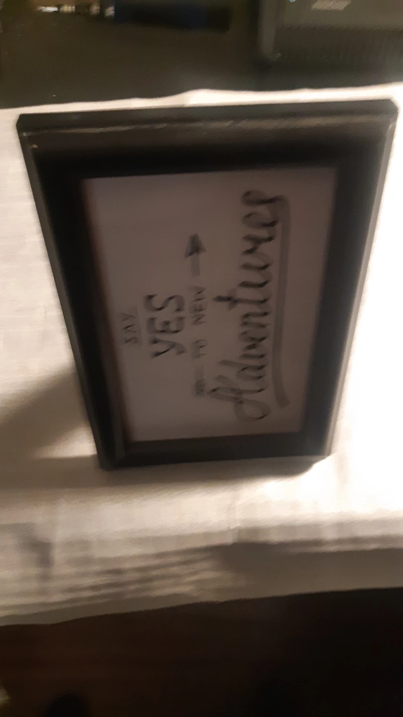 Small framed print. Black frame. Quote reads: Say Yes to New Adventures. Perfect for a bedroom or office.
