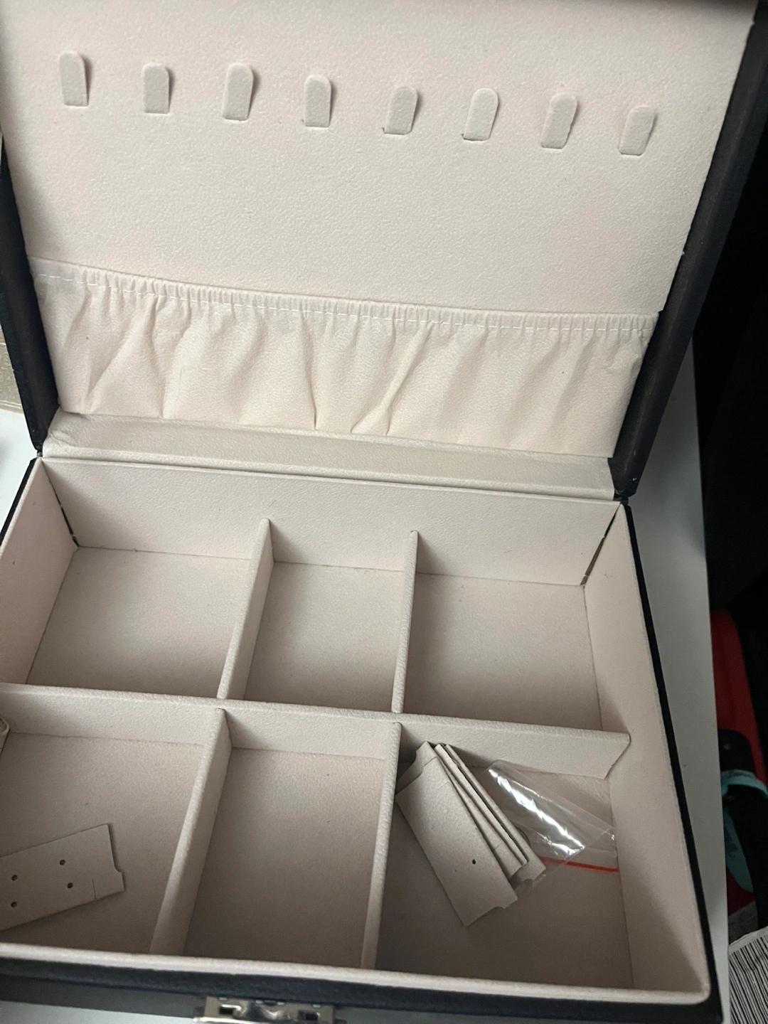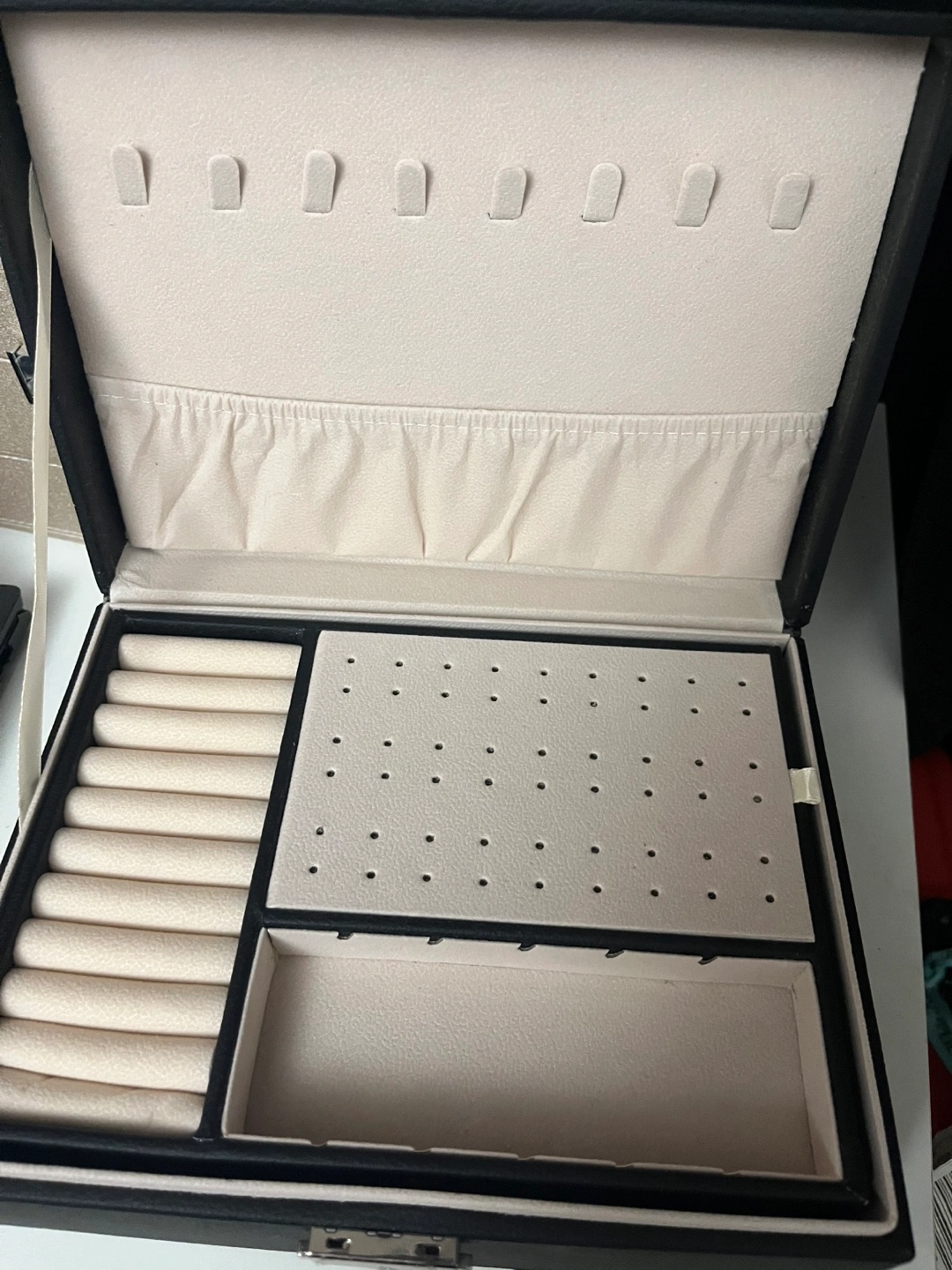 Buy & SellBlack Leatherette Jewellery Box OrganizerBlack Leatherette Jewellery Box Organizer$15Portable jewellery box. Multiple compartments for earrings, rings, necklaces and more. Soft beige interior. Black exterior. Metal clasp.ConditionNewWHERE TO MEET100 antibes drive northyorkView MapSELLERverifiedmimaWestminster38029 reviews0 chats·1 favorites·15 views