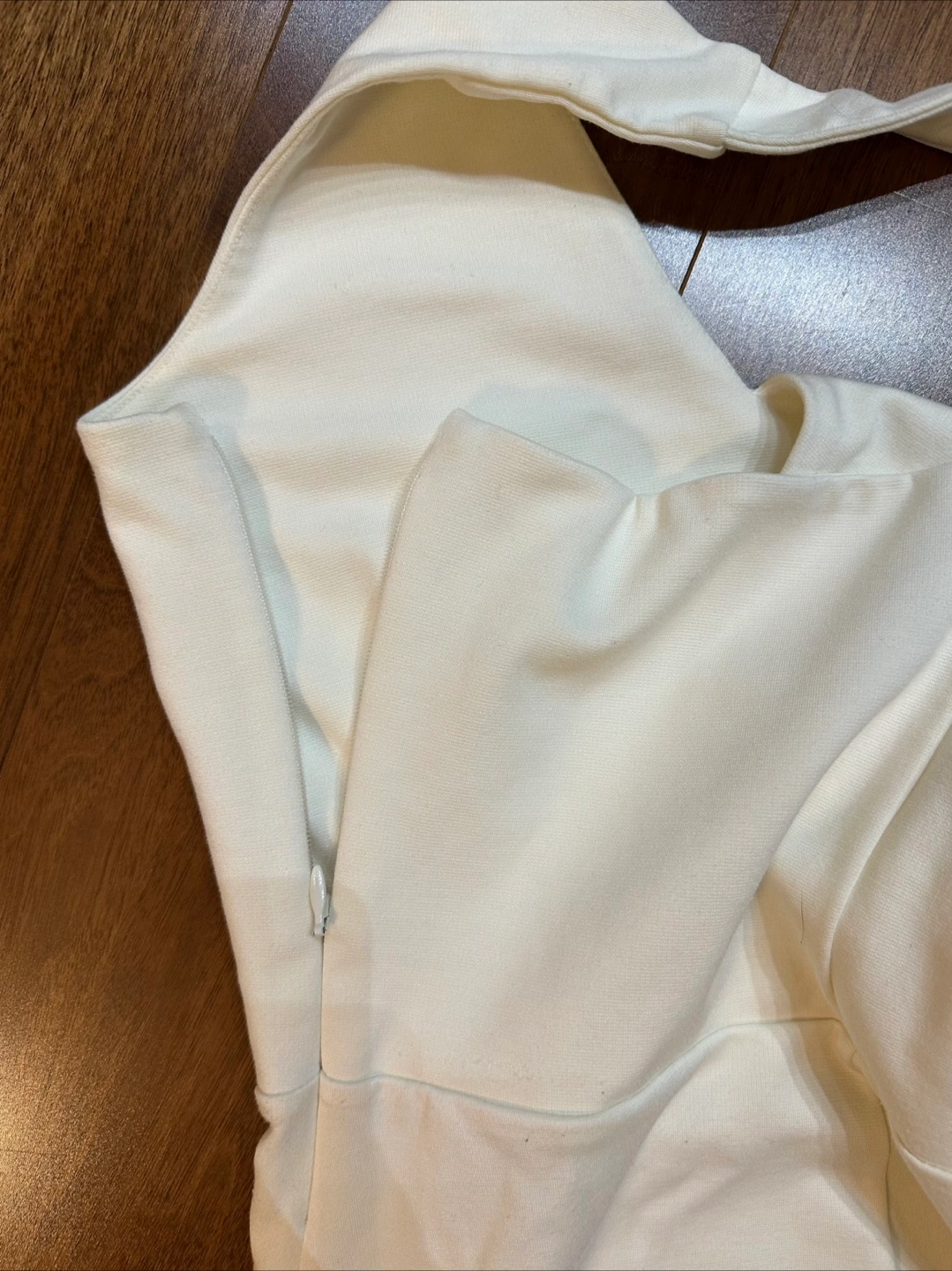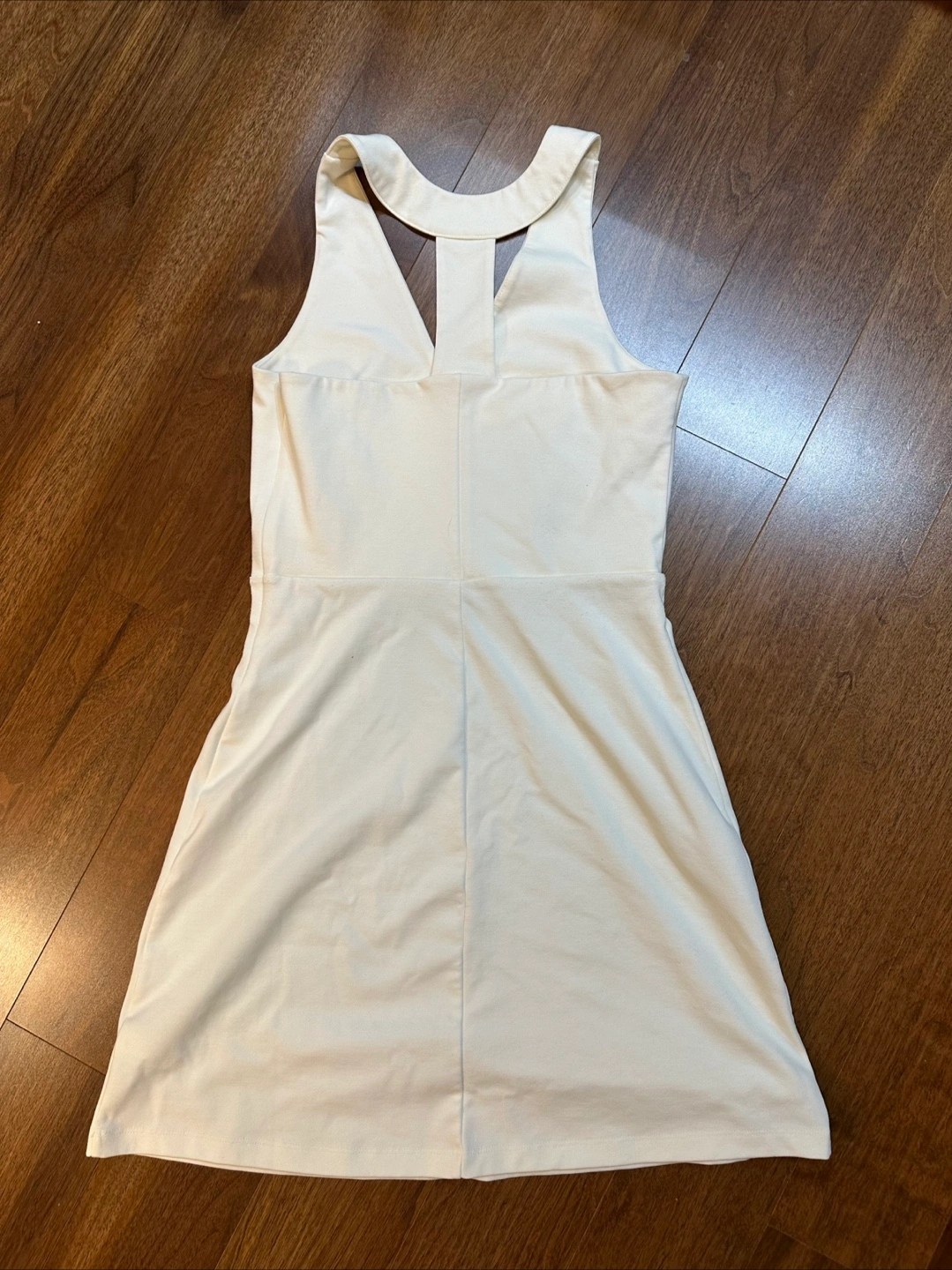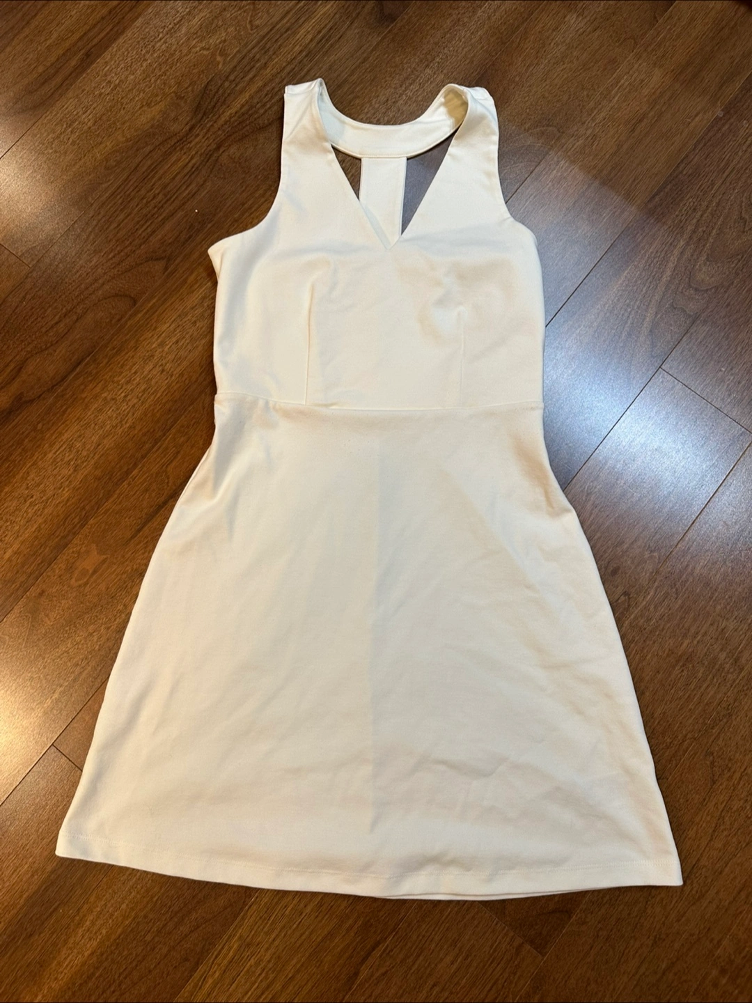 1000+Adorable sleeveless white dress. V shaped neckline, with Y back Fit and flare silhouette. Side zipper closure