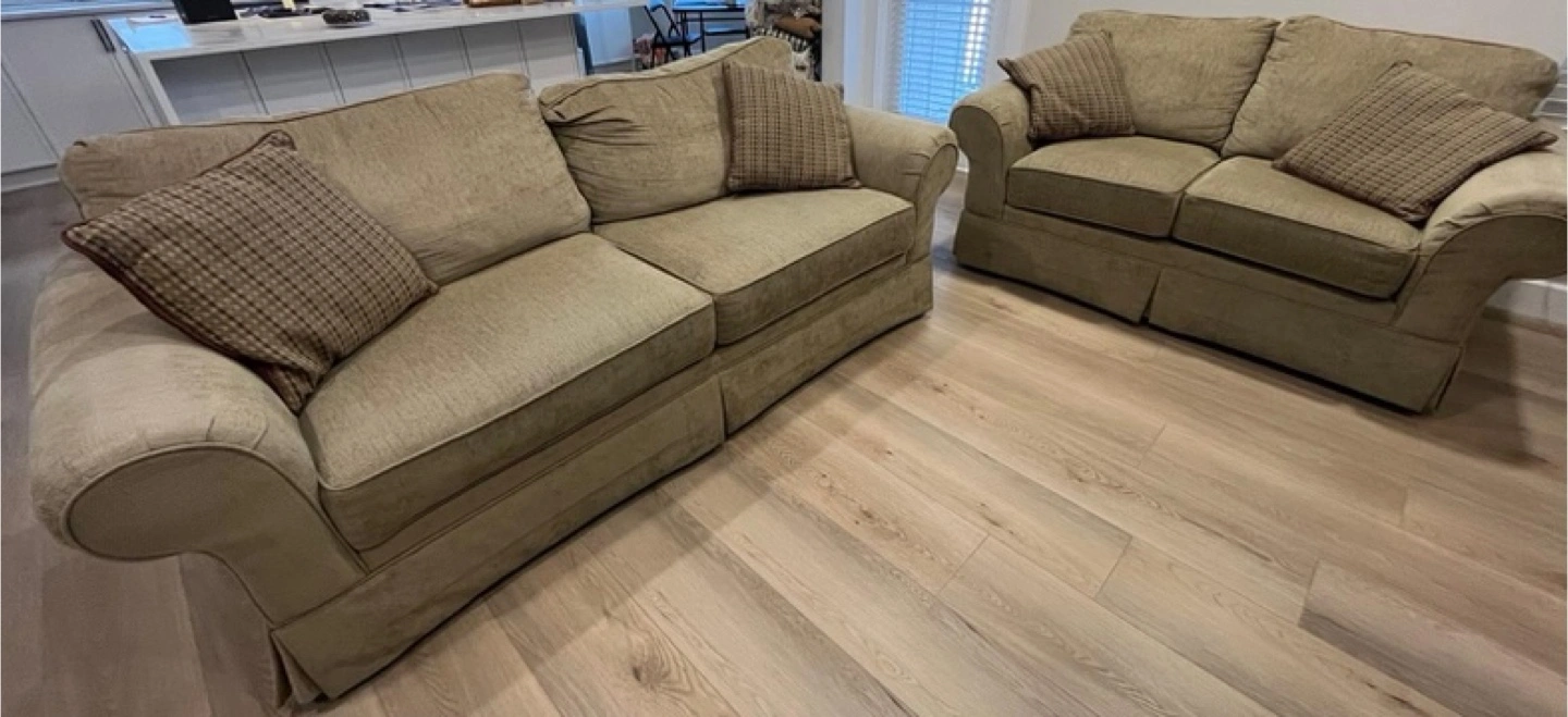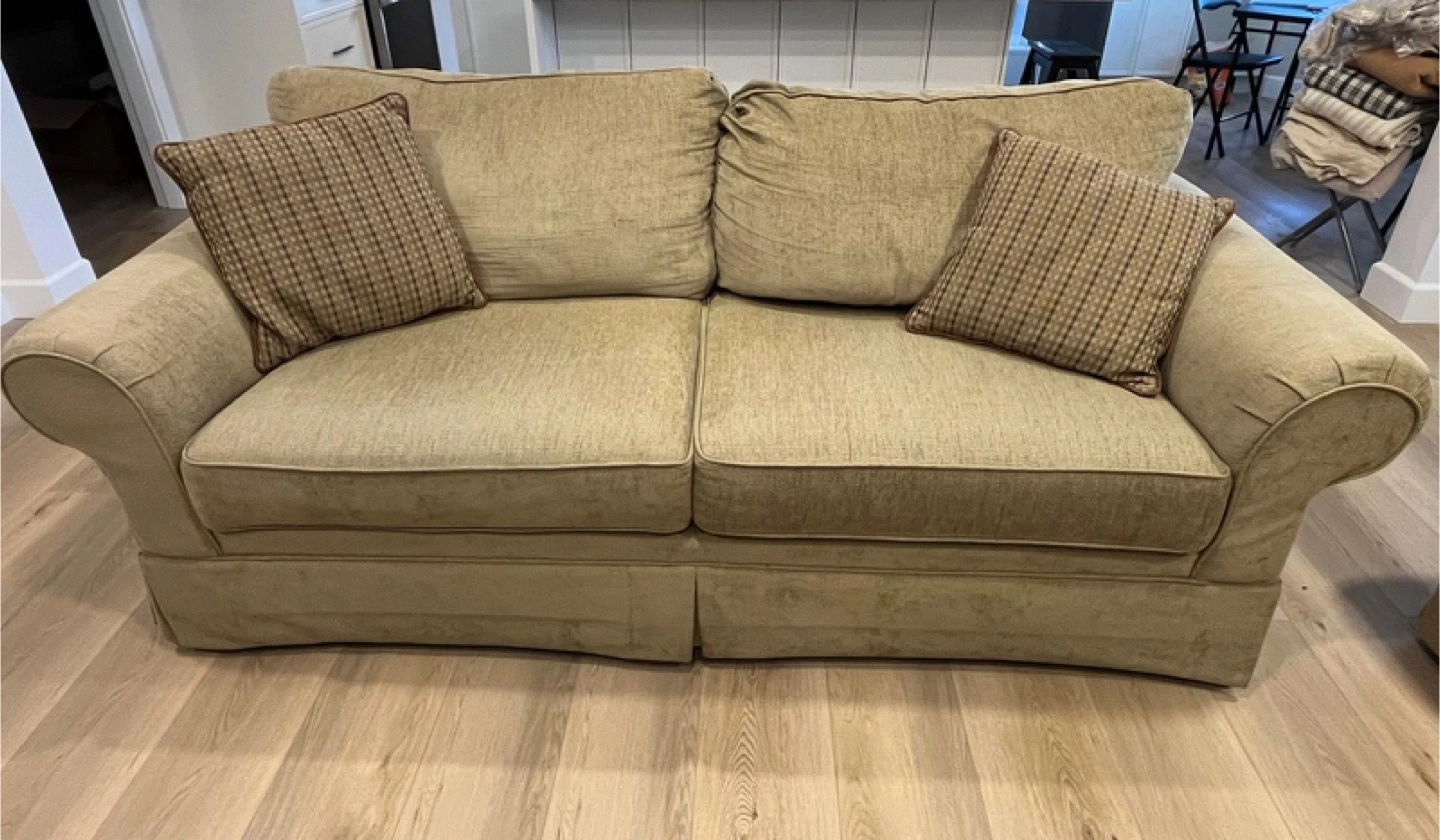 Comfortable sofa and loveseat set. Neutral beige colour. Includes throw pillows. Rolled arm design. Good condition. No stains or rips. Custom made by MJM furniture