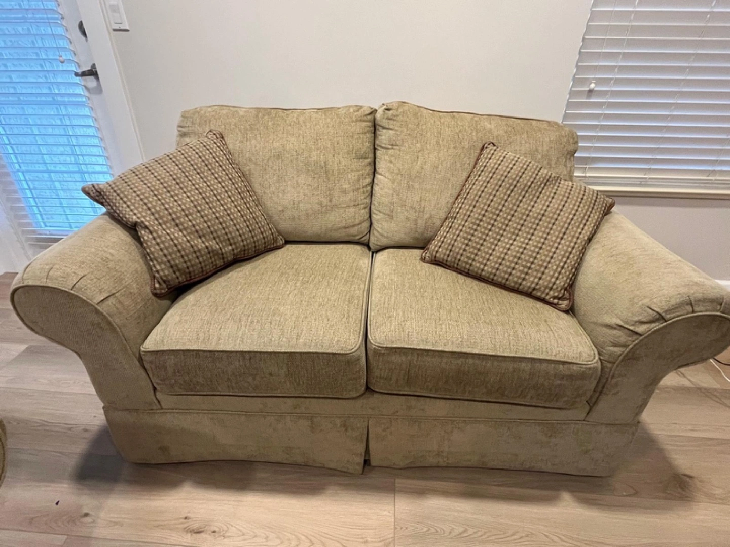 Comfortable sofa and loveseat set. Neutral beige colour. Includes throw pillows. Rolled arm design. Good condition. No stains or rips. Custom made by MJM furniture